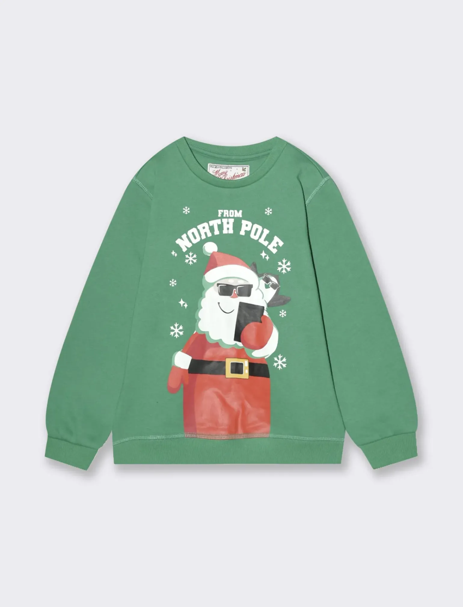 Felpa da bambino modello girocollo garzata con stampa frontale natalizia. Fondo maniche e corpo in costina. Il prodotto è di colore Verde