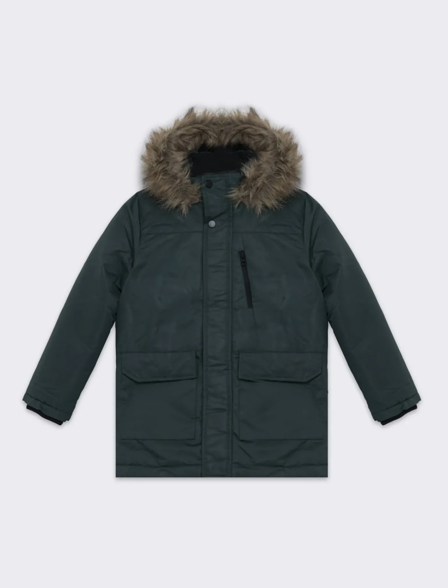 Giaccone da bambino con cappuccio in finta pelliccia. Fodera in finta pelliccia con taglio più lungo sul dietro. Tasconi frontali e stampe. Apertura con zip frontale e bottoni. Modello dall’aspetto dinamico, ideale per il tempo libero . Il prodotto è di colore Verde