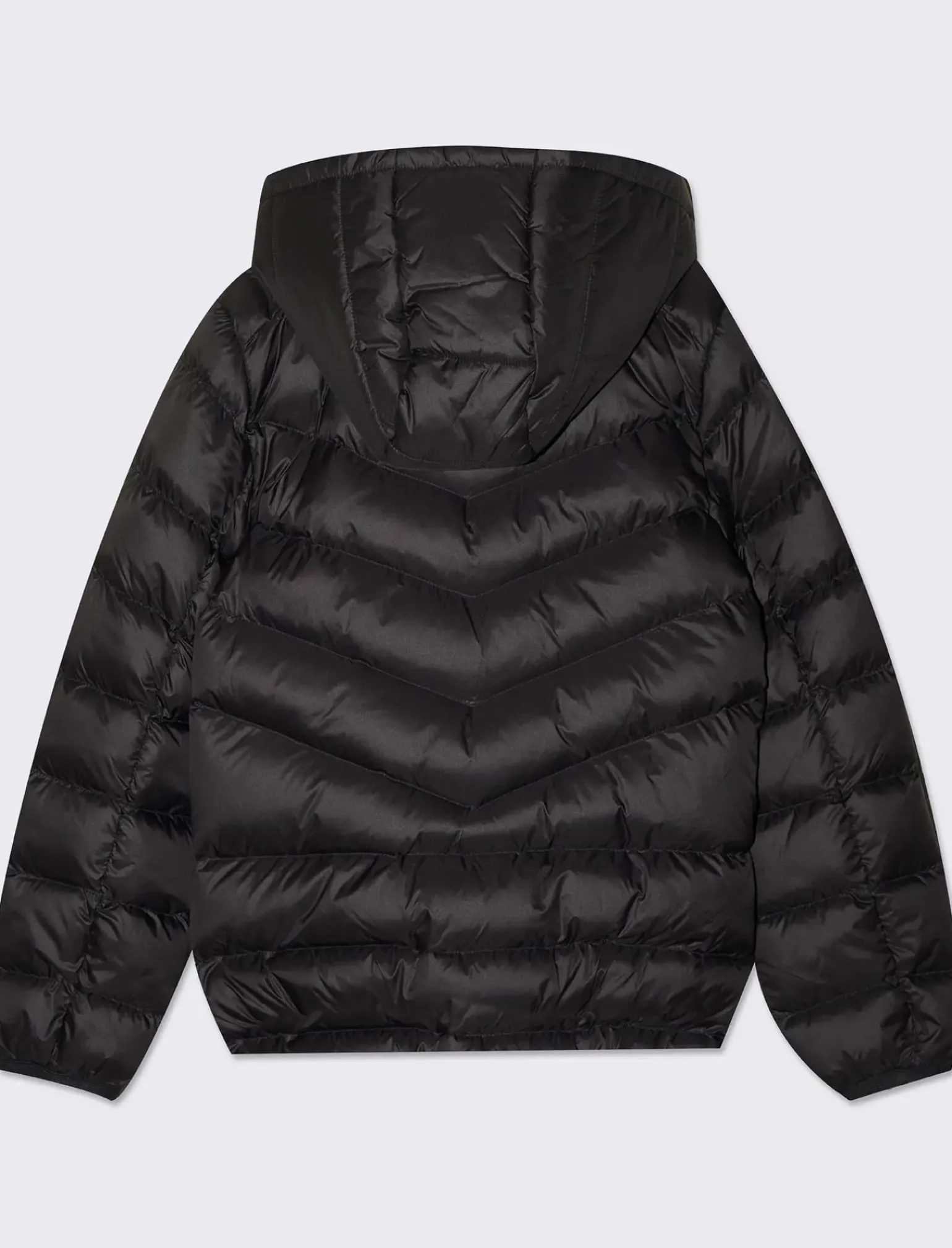 Giubbotto imbottito con cappuccio per bambini, perfetto per proteggerli dal freddo invernale. Dotato di comode zip sulle tasche e sul davanti, ideale per tenere al sicuro piccoli oggetti. Realizzato con materiali di alta qualità, garantisce calore e comfort in ogni occasione. Il prodotto è di colore Nero