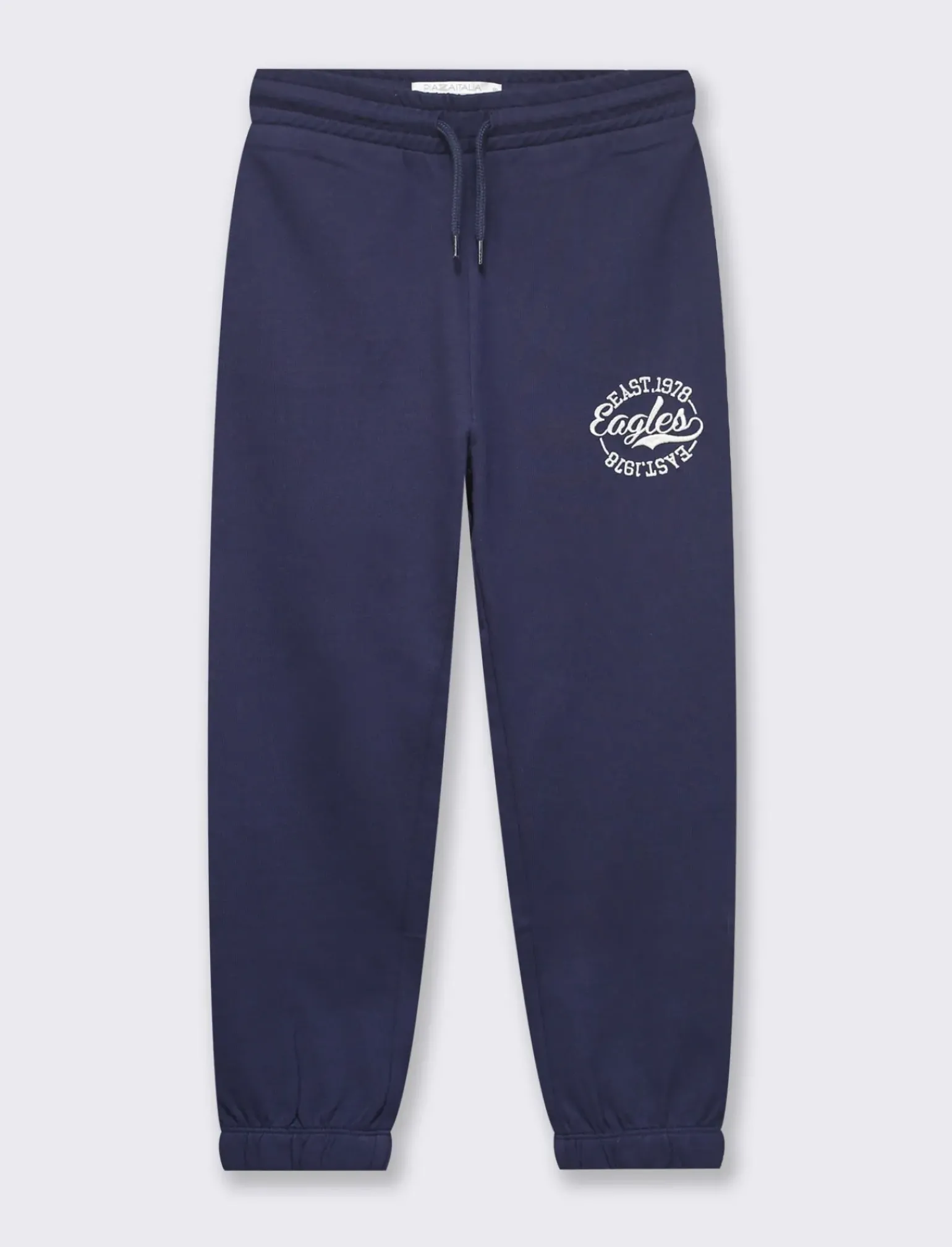 Jogger in felpa con ricamo per bambini, perfetti per un look sportivo e alla moda. Con coulisse e stile varsity, ideali per un look college. Comfort e stile per i più piccoli, da indossare in ogni occasione. Il prodotto è di colore Blu