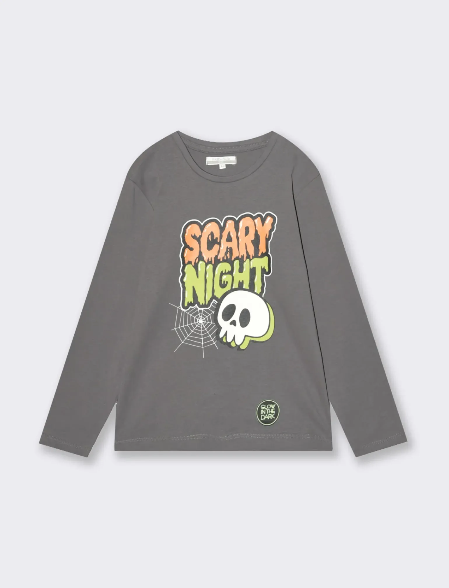 T.shirt da bambino manica lunga, modello girocollo. Stampa frontale halloween che si illumina al buio. Per un halloween strepitoso. Il prodotto è di colore Grigio antracite