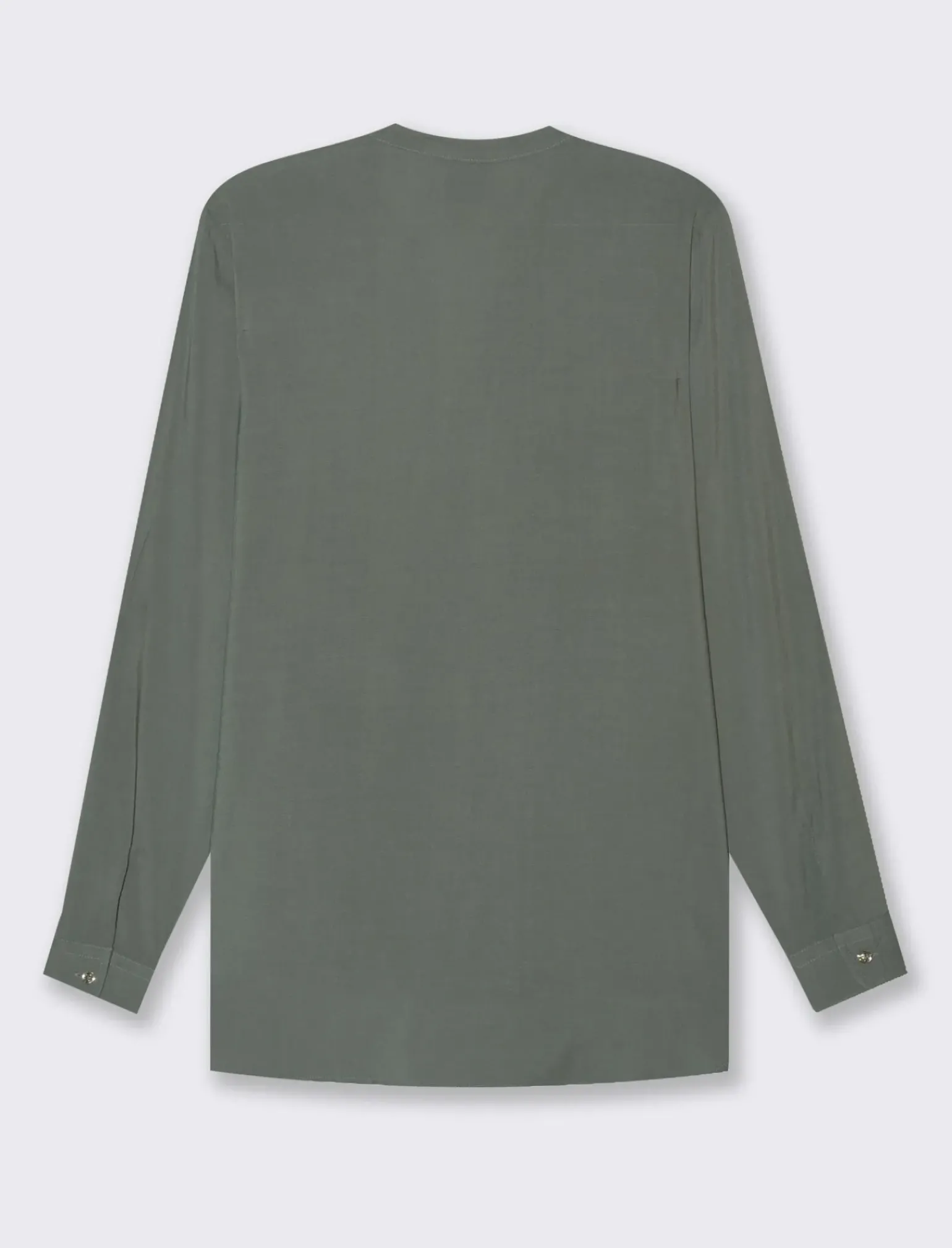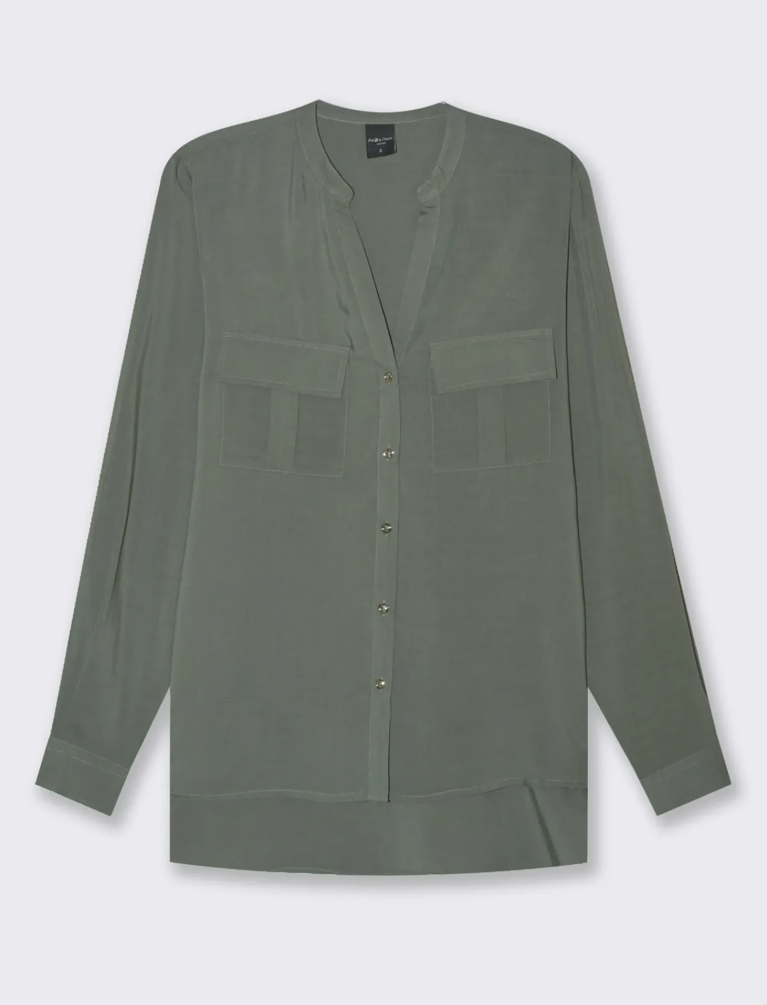 Camicia scollo a V per donna realizzata in morbida viscosa, con maniche lunghe che possono essere risvoltate grazie alle alette. Il particolare scollo a V è impreziosito da bottoni effetto metallo, mentre le tasche applicate aggiungono un tocco di praticità e stile. Il prodotto è di colore Verde foresta