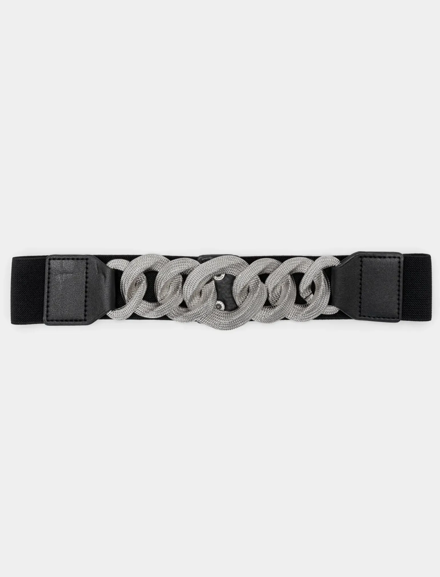 Cintura da donna elastica con catena centrale disponibile nelle taglie 70cm e 80cm. Un accessorio trendy e versatile per completare il tuo look in modo originale e alla moda. Perfetta per dare un tocco di stile ai tuoi outfit sia casual che eleganti. Il prodotto è di colore Argento
