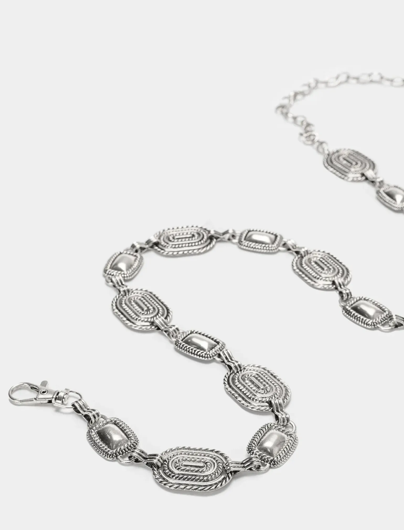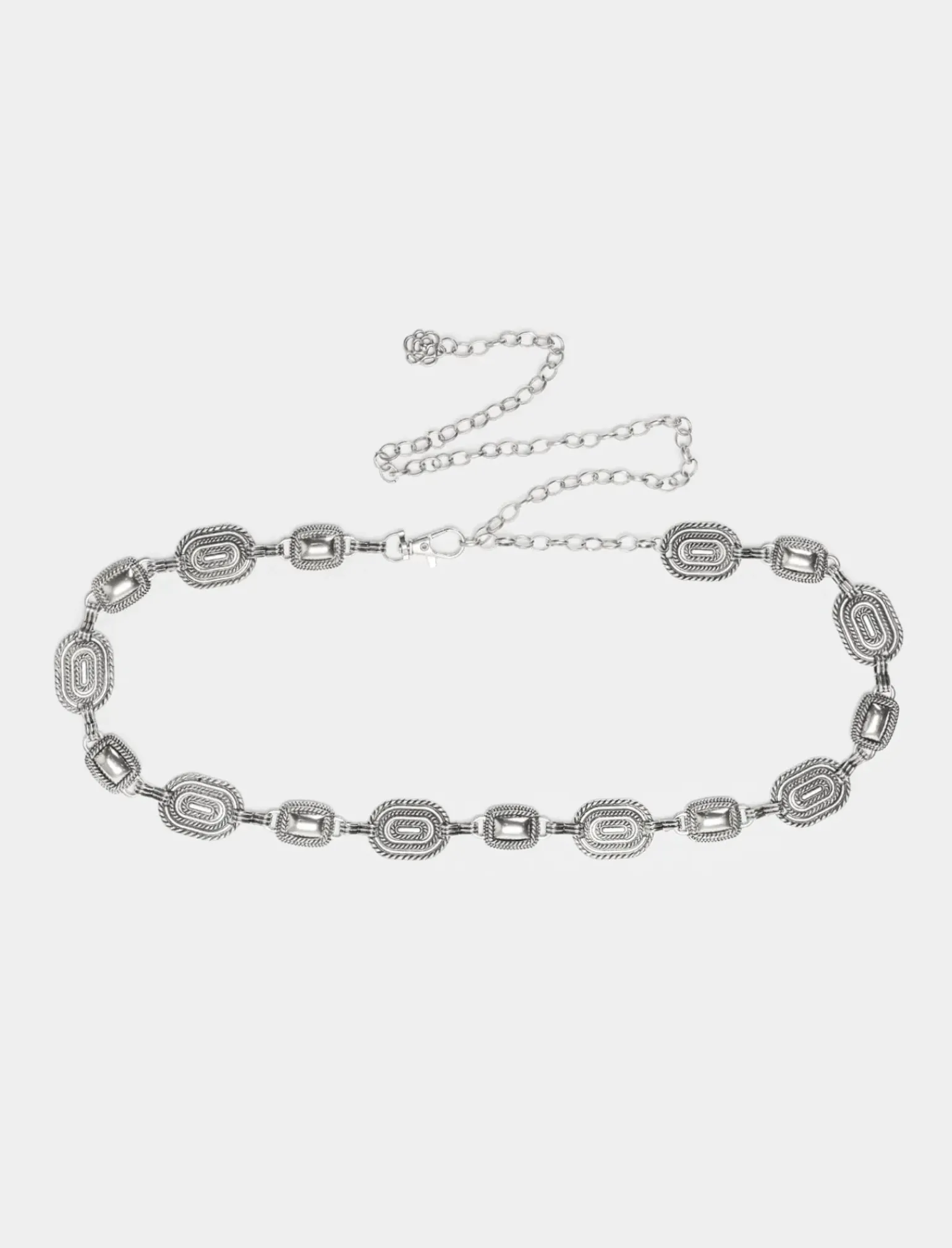 Cintura da donna in metallo di 110 cm, un accessorio elegante e versatile per completare il tuo look con stile. Realizzata con materiali di alta qualità, questa cintura si adatta perfettamente alla tua vita e aggiunge un tocco di classe ai tuoi outfit. Il prodotto è di colore Argento