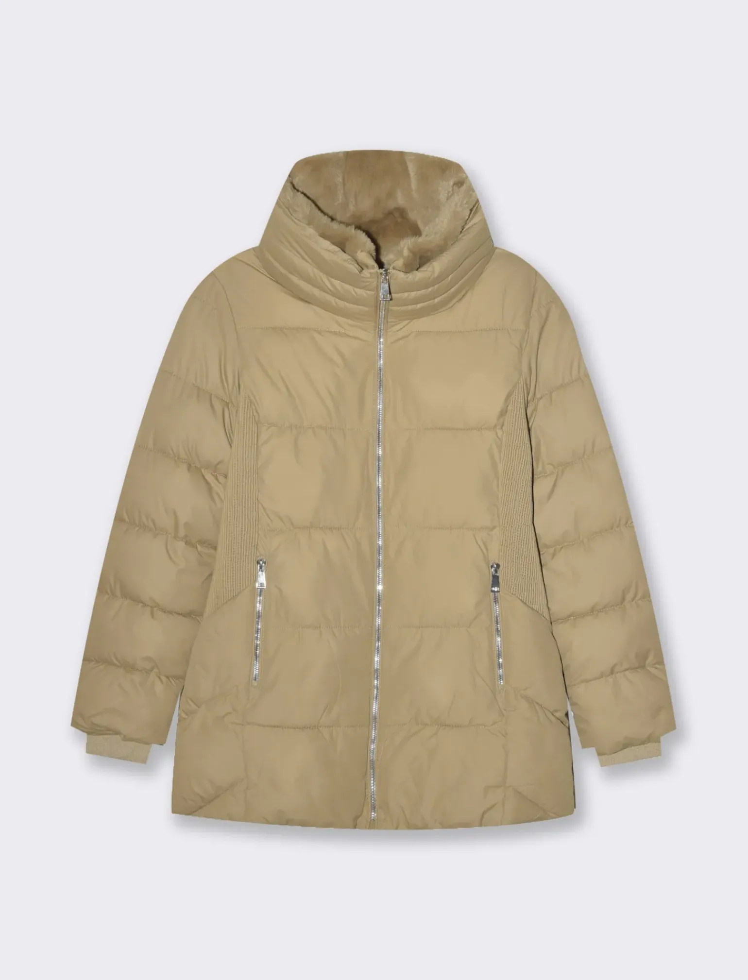 Giaccone imbottito dalla vestibilità slim, perfetto per la donna moderna che ama essere alla moda anche nei mesi più freddi. Con lunghezza media e chiusura a zip frontale, questo capo presenta dettagli in metallo dorato che conferiscono un tocco di eleganza e originalità. Il prodotto è di colore Cammello
