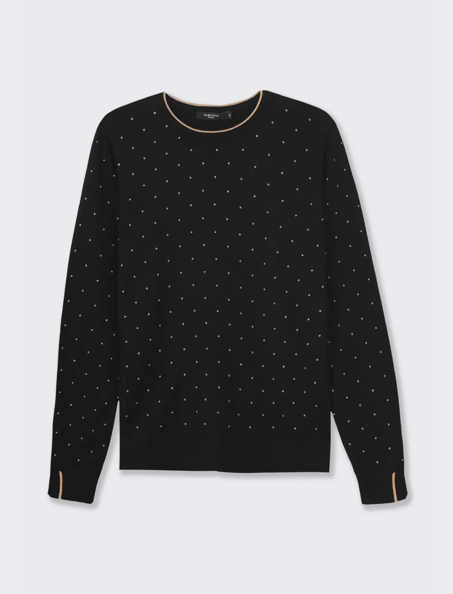 Maglia girocollo donna con motivo floccato stampato, realizzata in morbido filato per garantire comfort e stile. Disponibile in una varietà di colori vivaci e alla moda, perfetta per completare ogni outfit con un tocco di originalità e femminilità. Il prodotto è di colore Nero