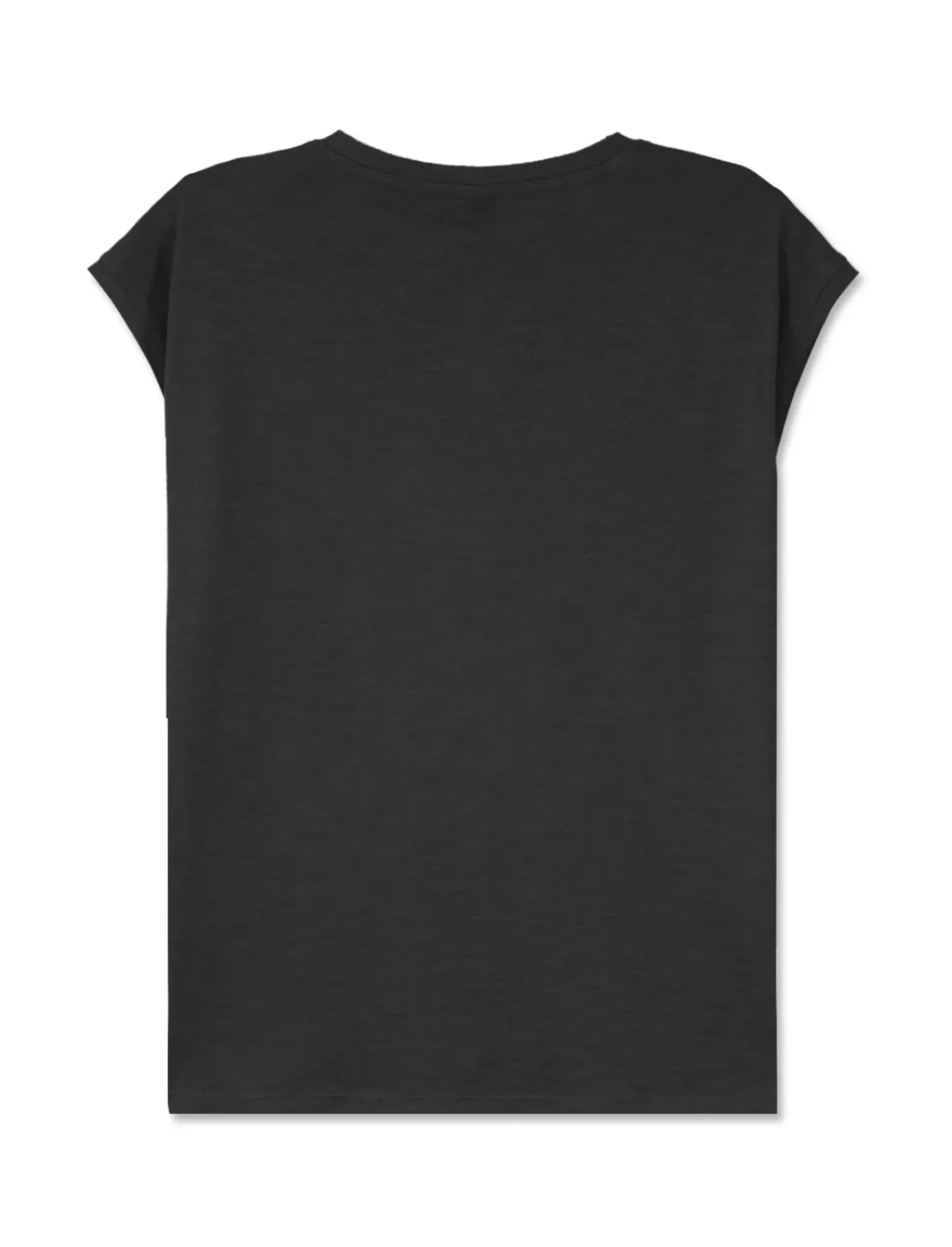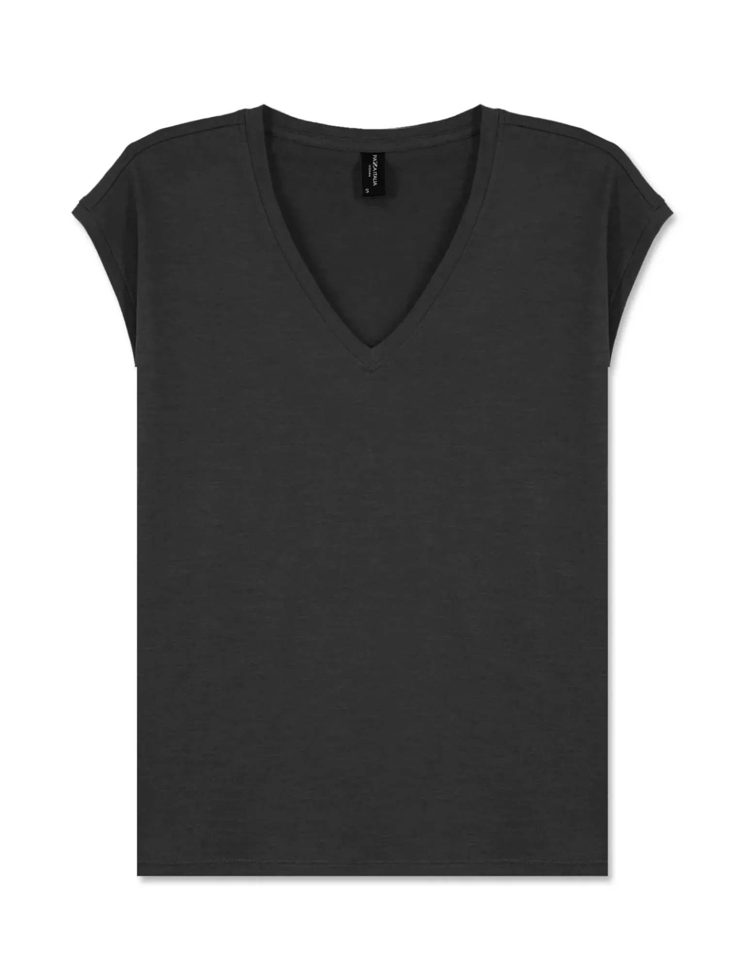 Maglietta perfetta per ogni occasione, dal look casual a quello più elegante. Realizzata in morbido tessuto slub di cotone, garantisce comfort e stile. Il taglio scollo a V valorizza il décolleté femminile, mentre le maniche corte la rendono adatta alla stagione estiva. Il prodotto è di colore Nero