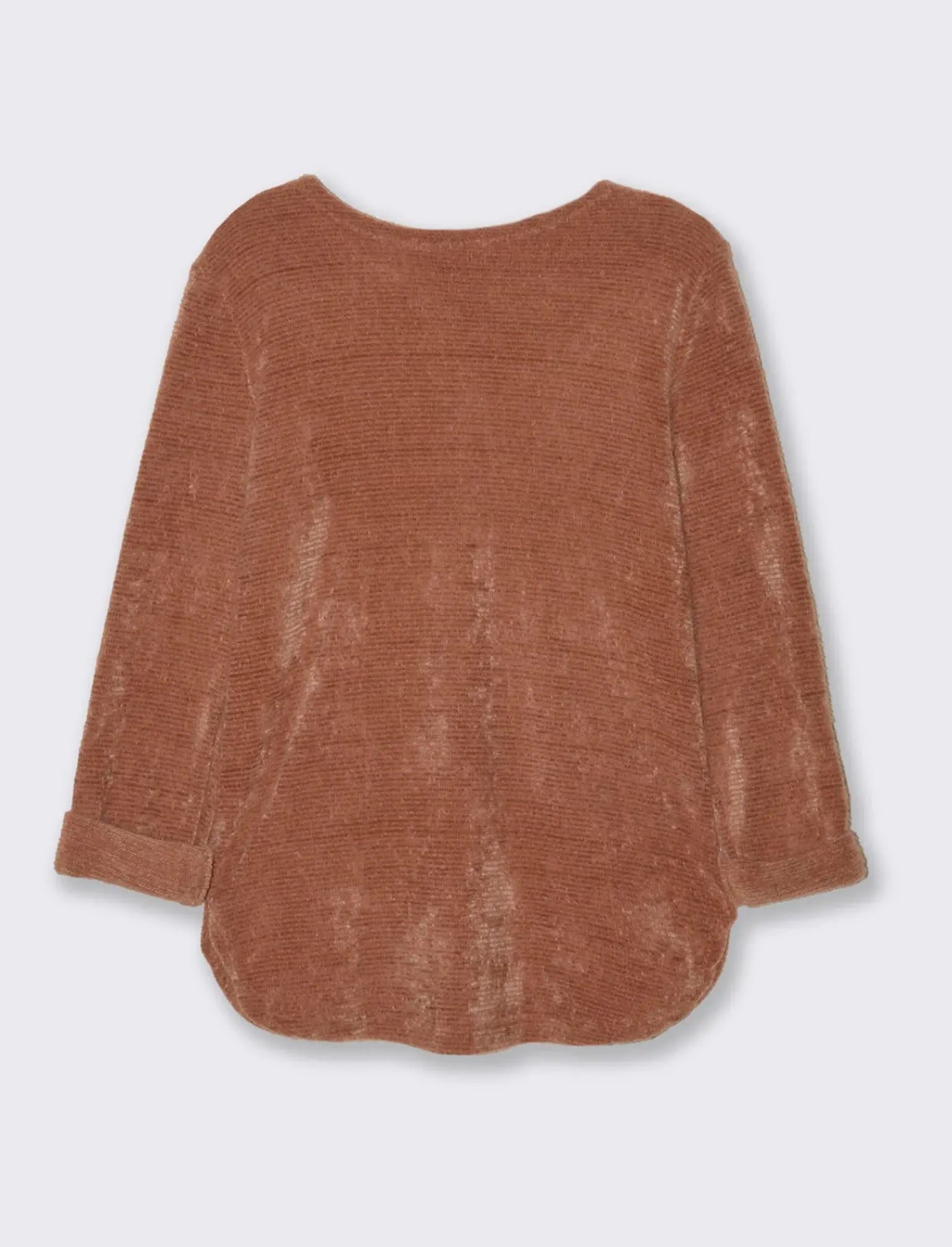Maglia in filato effetto peluche tinta unita; scollo a barca; maniche lunghe. Il prodotto è di colore Moro