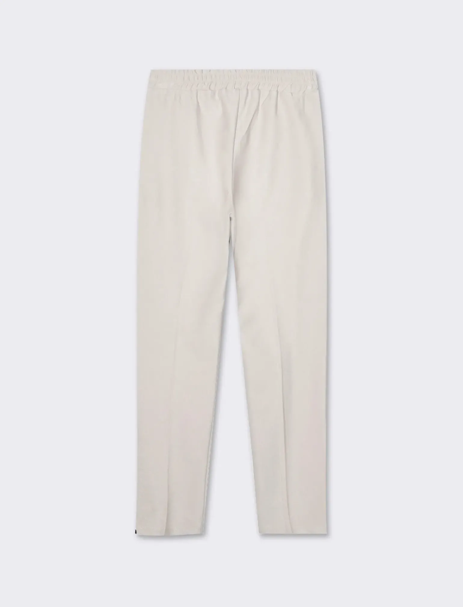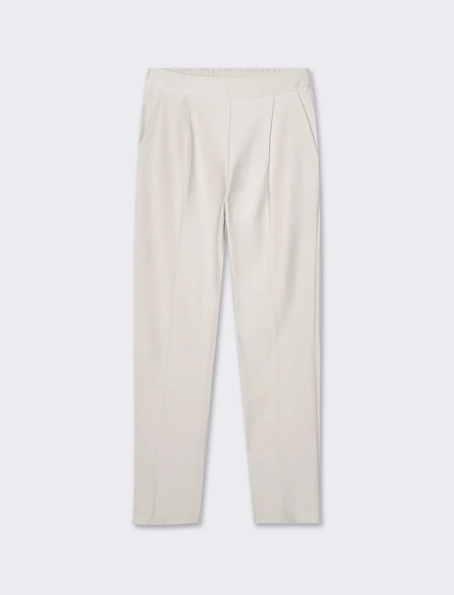 Pantaloni con un elastico in vita sul retro, che garantisce una vestibilità comoda e adattabile. La parte anteriore mantiene un aspetto pulito e ordinato, mentre l’elastico sul retro assicura che i pantaloni si adattino perfettamente alla tua figura. Le tasche americane sui fianchi offrono praticità e un tocco di stile casual, ideali per riporre piccoli oggetti come chiavi o telefono. La vestibilità slim conferisce un look moderno e snello, seguendo le linee del corpo senza essere troppo aderente. Il prodotto è di colore Bianco burro