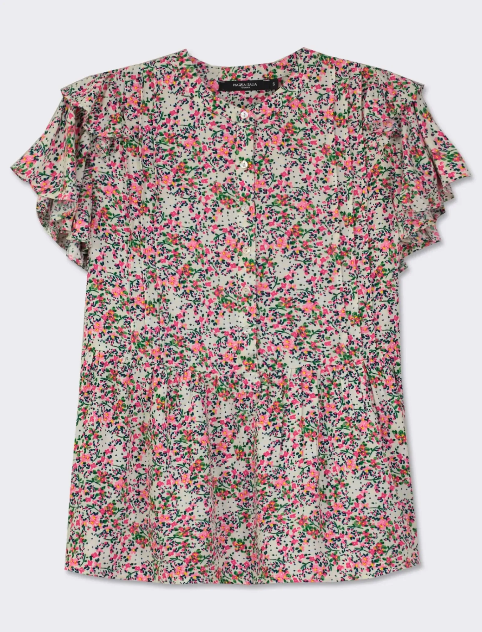 Top stampato in tessuto di viscosa con maniche volant, perfetto per un look fresco e femminile. La particolare apertura frontale con bottoni aggiunge un tocco di originalità al capo, disponibile in varie fantasie per soddisfare ogni stile. Ideale per un outfit estivo che non passa inosservato. Il prodotto è di colore var 1