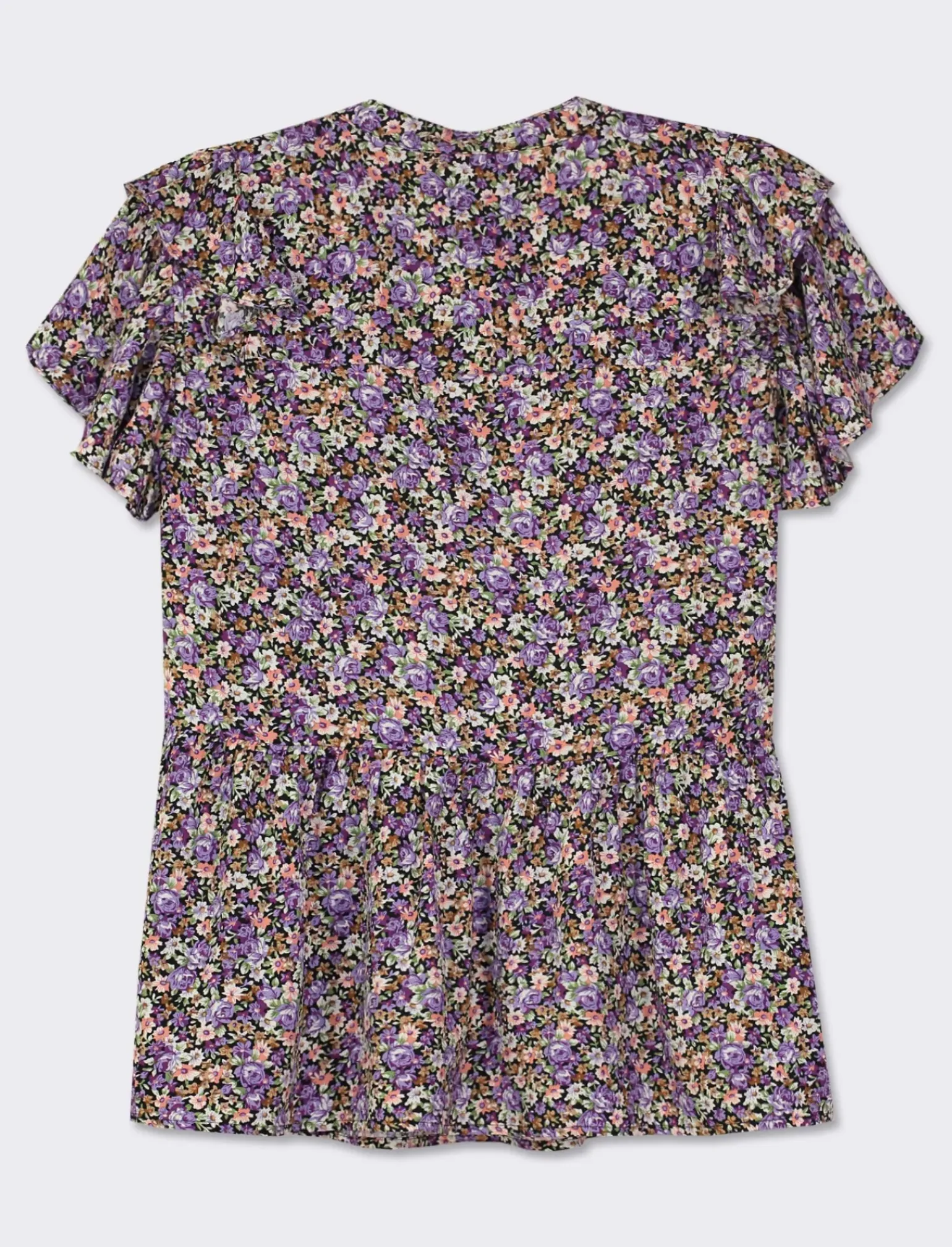 Top stampato in tessuto di viscosa con maniche volant, perfetto per un look fresco e femminile. La particolare apertura frontale con bottoni aggiunge un tocco di originalità al capo, disponibile in varie fantasie per soddisfare ogni stile. Ideale per un outfit estivo che non passa inosservato. Il prodotto è di colore var 2