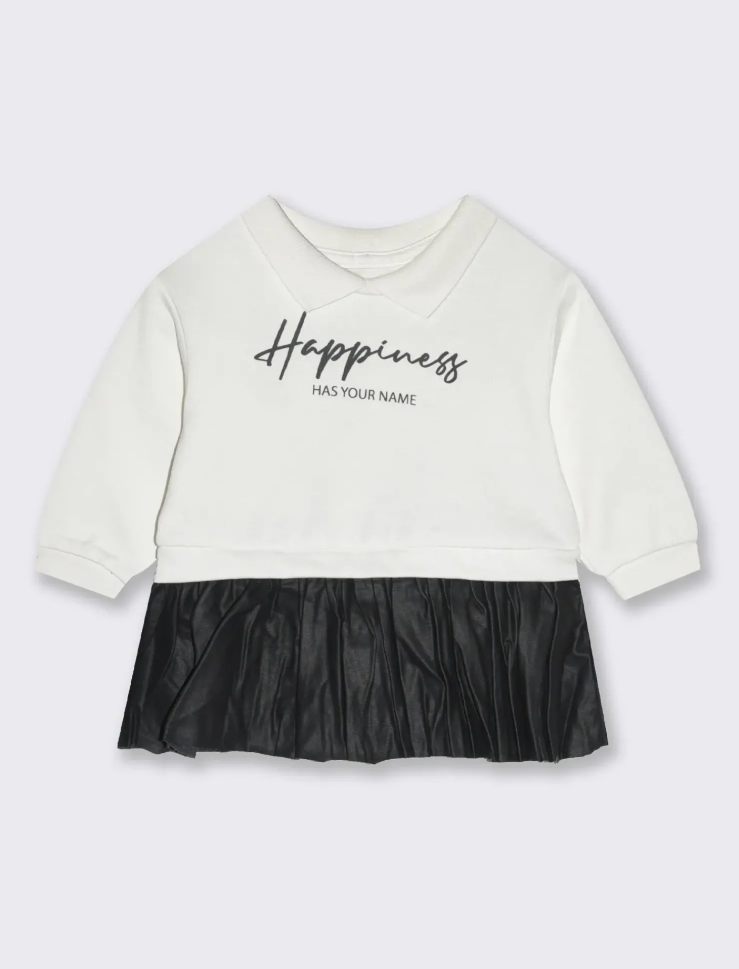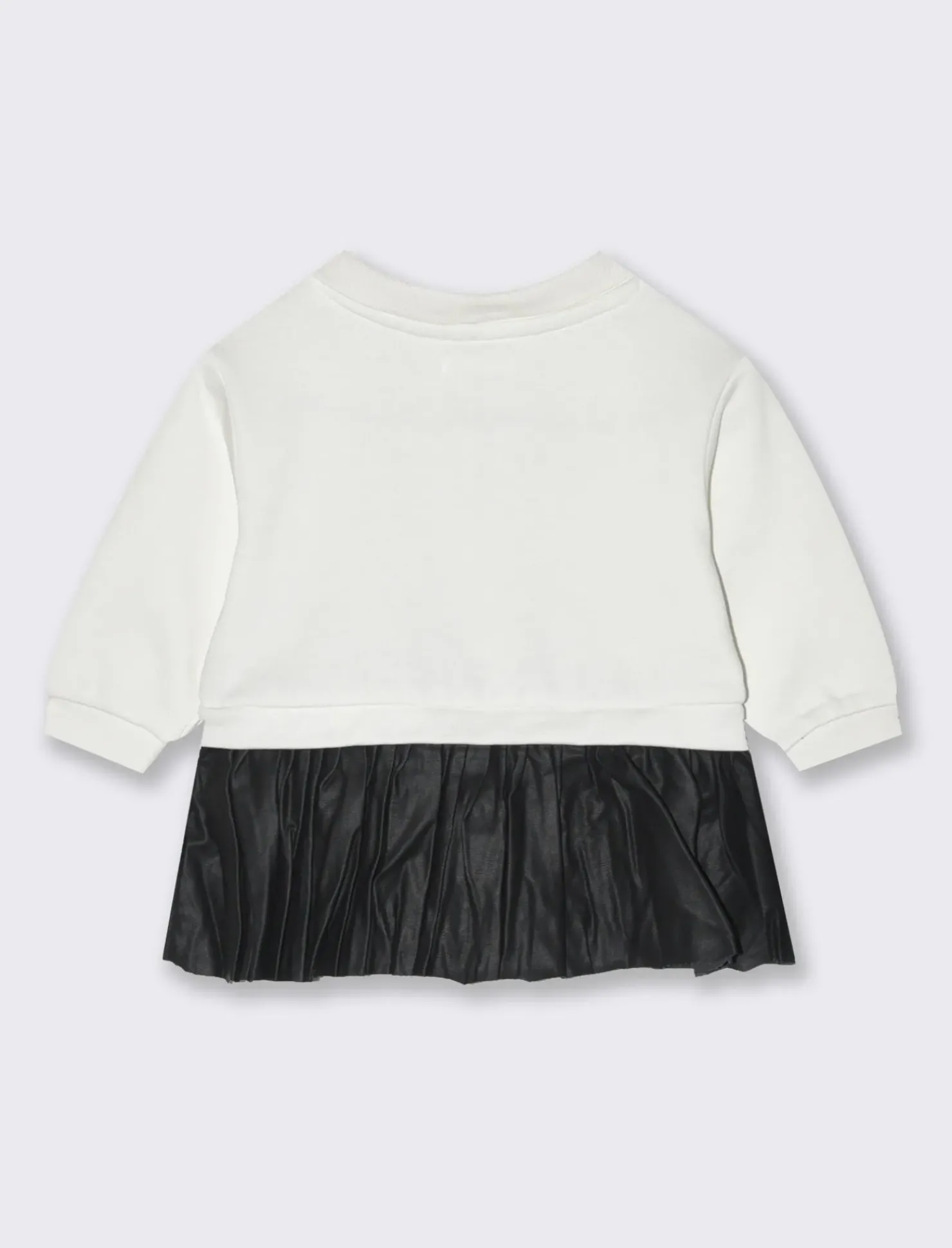 Abito che unisce comfort e stile in un design unico e accattivante. La parte superiore di questo abito è realizzata in felpa morbida, offrendo una sensazione di calore e comodità, perfetta per le giornate casual. La felpa è decorata con una stampa frontale che aggiunge un tocco di personalità e originalità al capo. La parte inferiore dell’abito è in semilpelle a pieghe, creando un contrasto interessante e moderno con la parte superiore in felpa. Le pieghe donano movimento e struttura, aggiungendo un elemento di eleganza e raffinatezza al look complessivo. I dettagli in costina, presenti sui polsini e sull’orlo, completano il design, conferendo un aspetto curato e ben rifinito. Questi dettagli non solo migliorano la vestibilità, ma aggiungono anche un tocco di stile sportivo e contemporaneo.Il presente prodotto è conforme al rischio generico di sicurezza di cui allart.5 del Regolamento Europeo 988/2023. Il prodotto è di colore Bianco panna