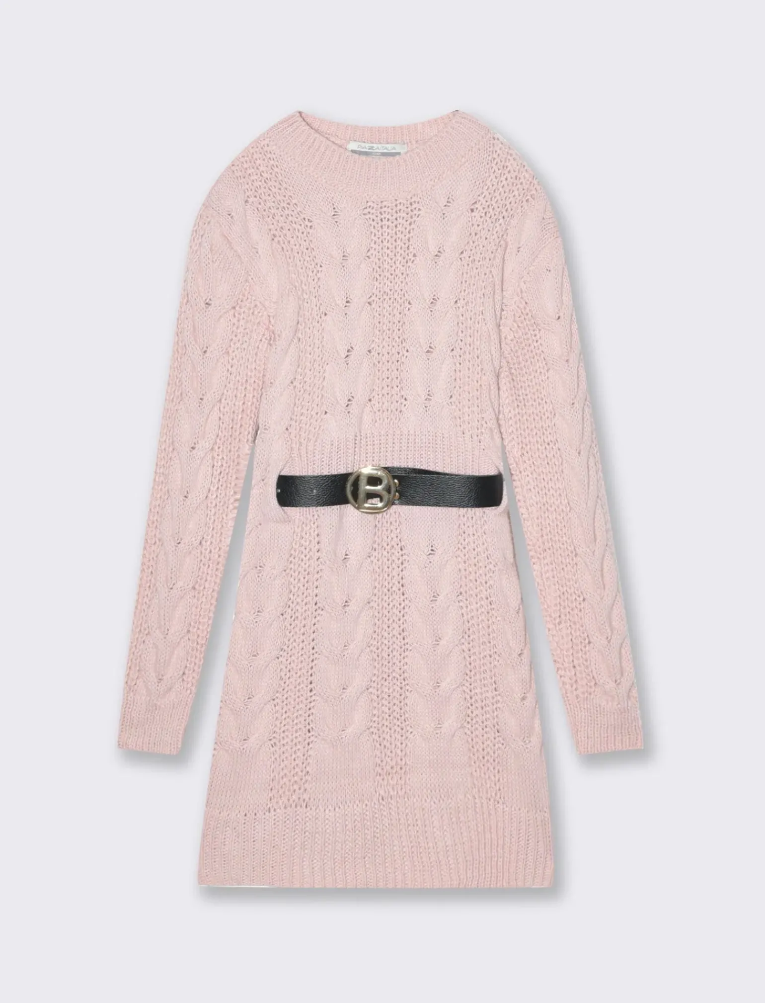 Abito mezzo collo da bambina a trecce, cintura in vita per un look sbarazzino. Il prodotto è di colore Rosa