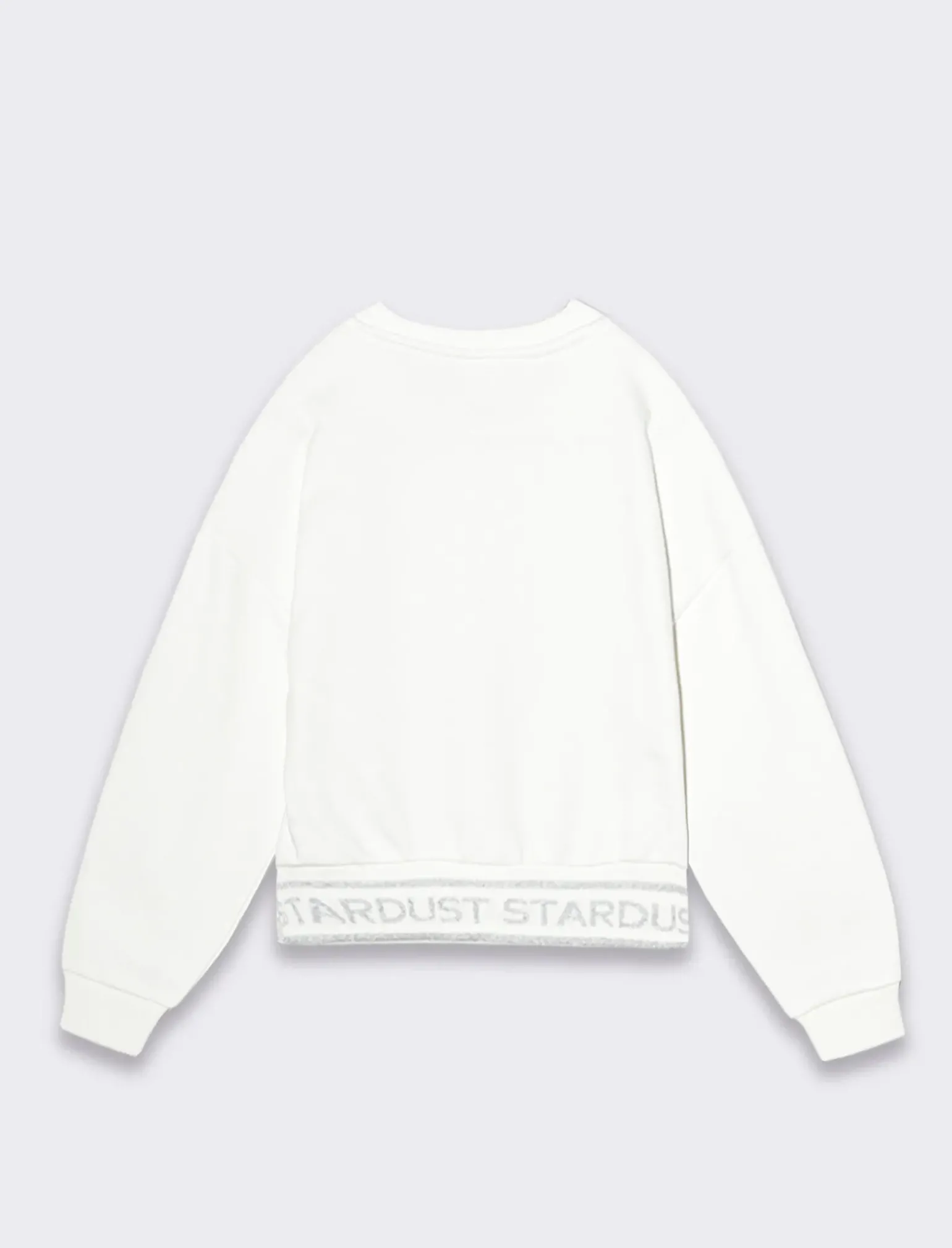 Felpa girocollo per bambina con una vestibilità regular e una costina intarsiata arricchita da scritte e righe argento. Il dettaglio della stampa argento con applicazione di strass conferisce un tocco di eleganza e originalità al capo. Ideale per un look casual ma al tempo stesso ricercato, perfetto per le piccole fashioniste in erba. Il prodotto è di colore Bianco sporco