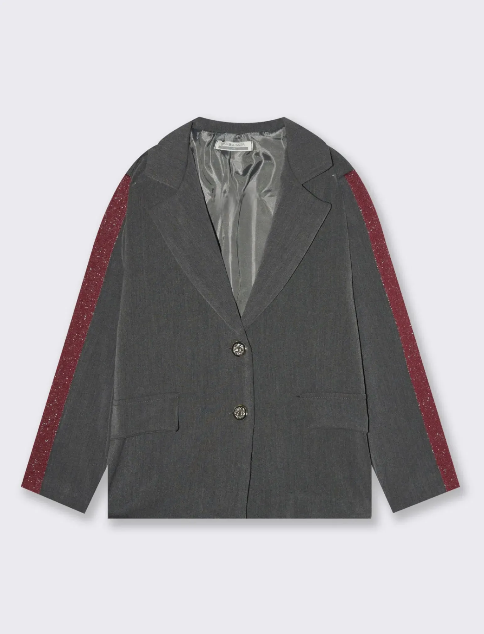 Giacca revers, modello elegante in tessuto morbido foderato internamente. Arricchita da bandine laterali a contrasto sulle maniche. Finte tasche sul davanti e bottoni intarsiati. Il prodotto è di colore Grigio