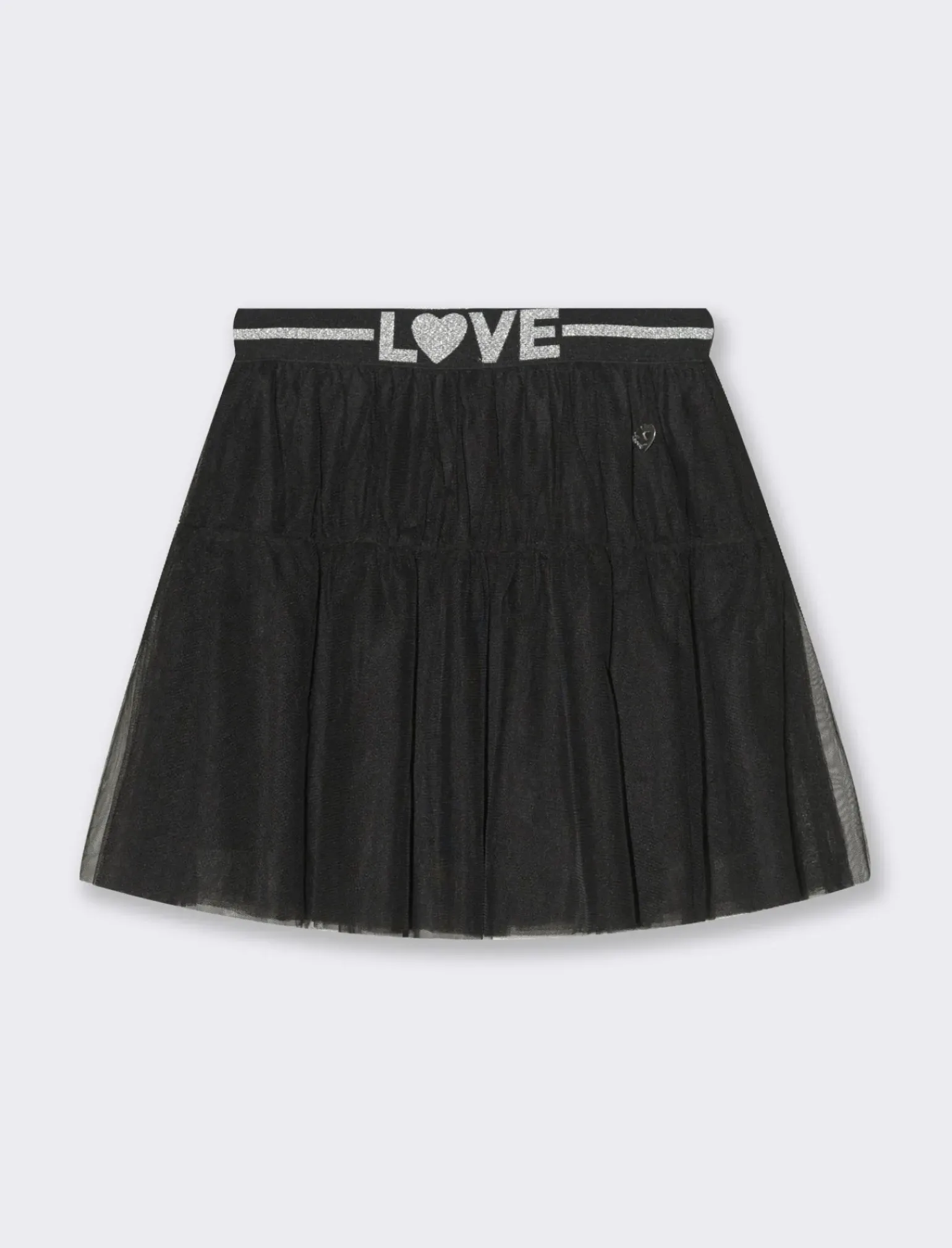 Gonna in tulle con elastico in vita per bambina, perfetta per un look elegante e giocoso. Le scritte e le righe in lurex a contrasto aggiungono un tocco di brillantezza e originalità al capo. Ideale per completare un outfit da cerimonia o per un’occasione speciale. Il prodotto è di colore Nero