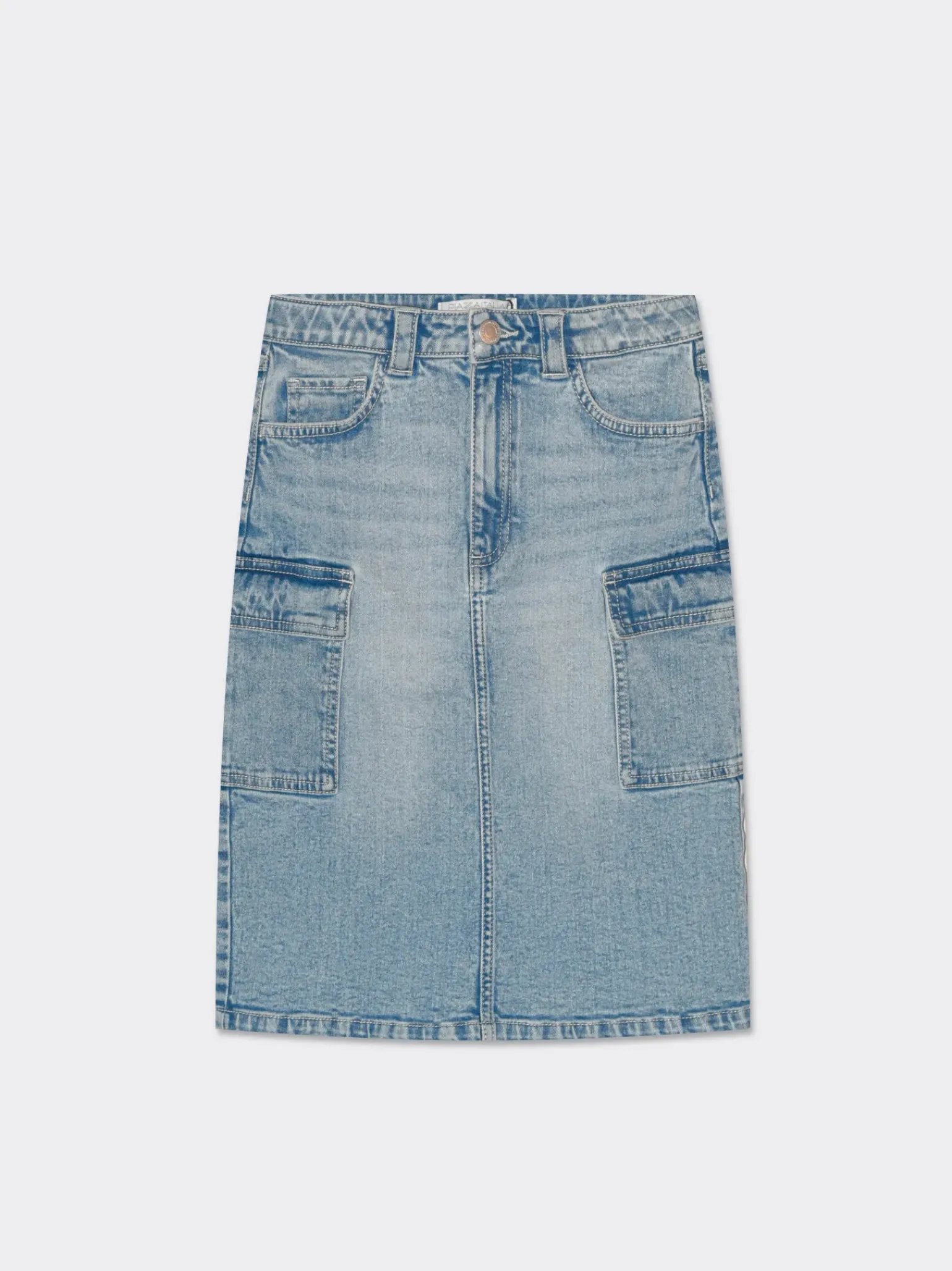 Gonna lunga in denim con tasconi per bambina. Un capo comodo e versatile, perfetto per le giornate di gioco e divertimento. Il lavaggio chiaro dona un tocco di freschezza, mentre l’elastico regolabile in vita assicura una vestibilità perfetta. Ideale per creare outfit trendy e comodi per le piccole fashioniste di casa. Il prodotto è di colore Denim
