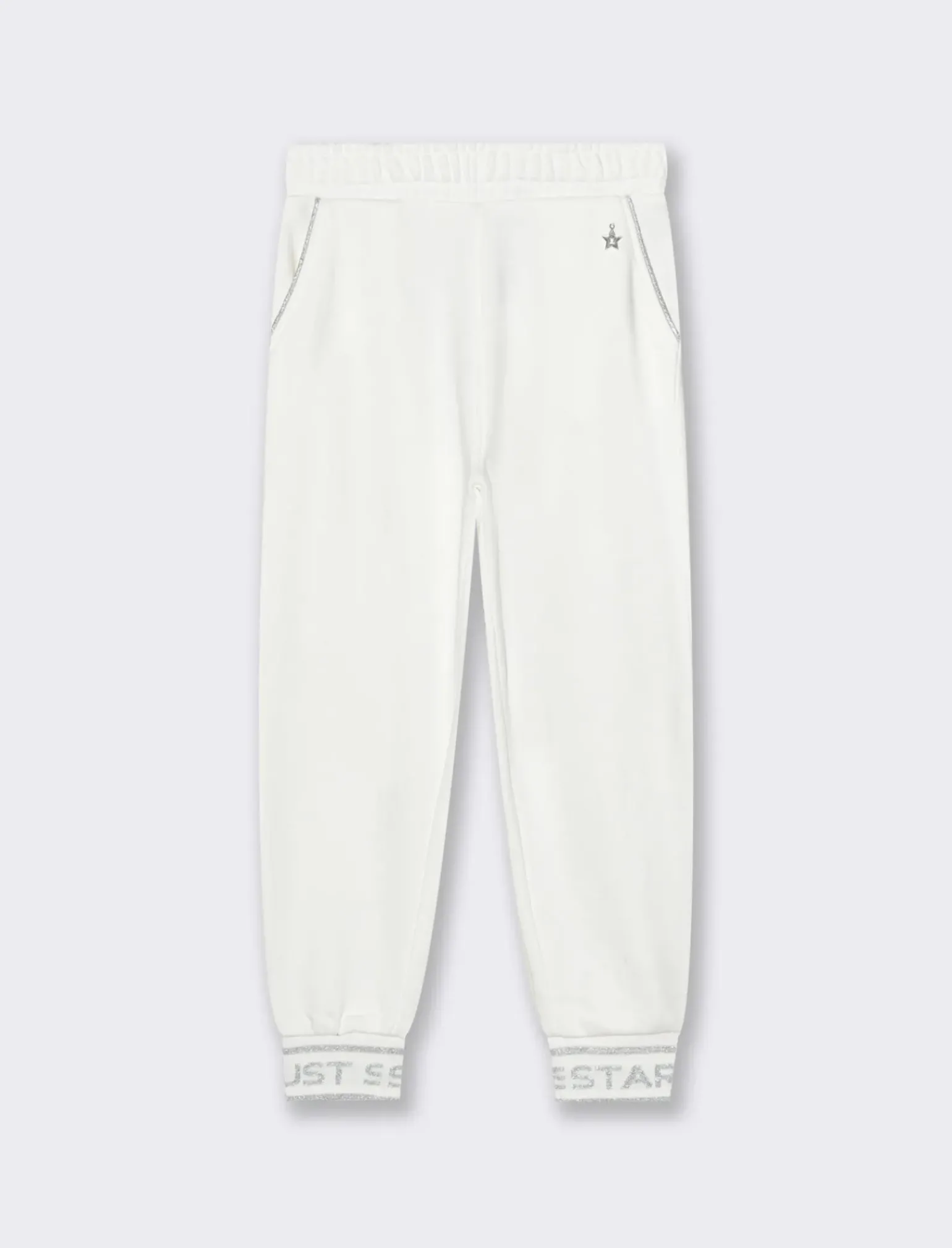 Pantaloni in felpa con elastico in vita per bambina, ideali per un look comodo e alla moda. La costina elastica al fondo con motivo jaquard argento aggiunge un tocco di stile unico. Perfetti per le giornate di gioco e di svago, garantendo libertà di movimento e comfort. Il prodotto è di colore Bianco sporco