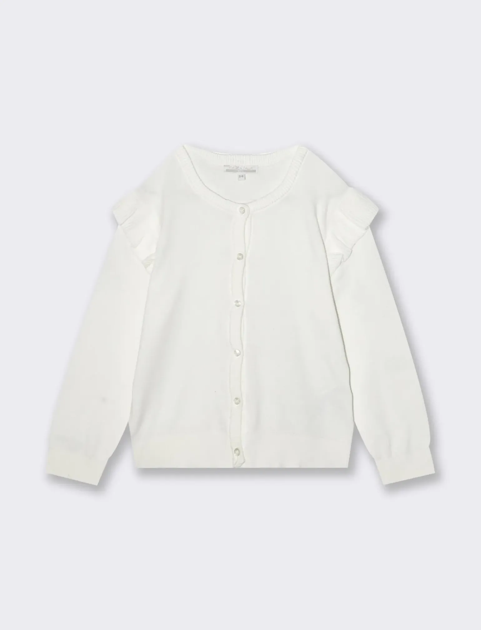 Cardigan in cotone per bambina, perfetto per completare ogni outfit con stile e comfort. Realizzato in morbida maglia di cotone, presenta graziose rouches sulle spalle e una pratica abbottonatura sul davanti. La vestibilità regolare assicura libertà di movimento per le piccole fashioniste di casa. Il prodotto è di colore Bianco
