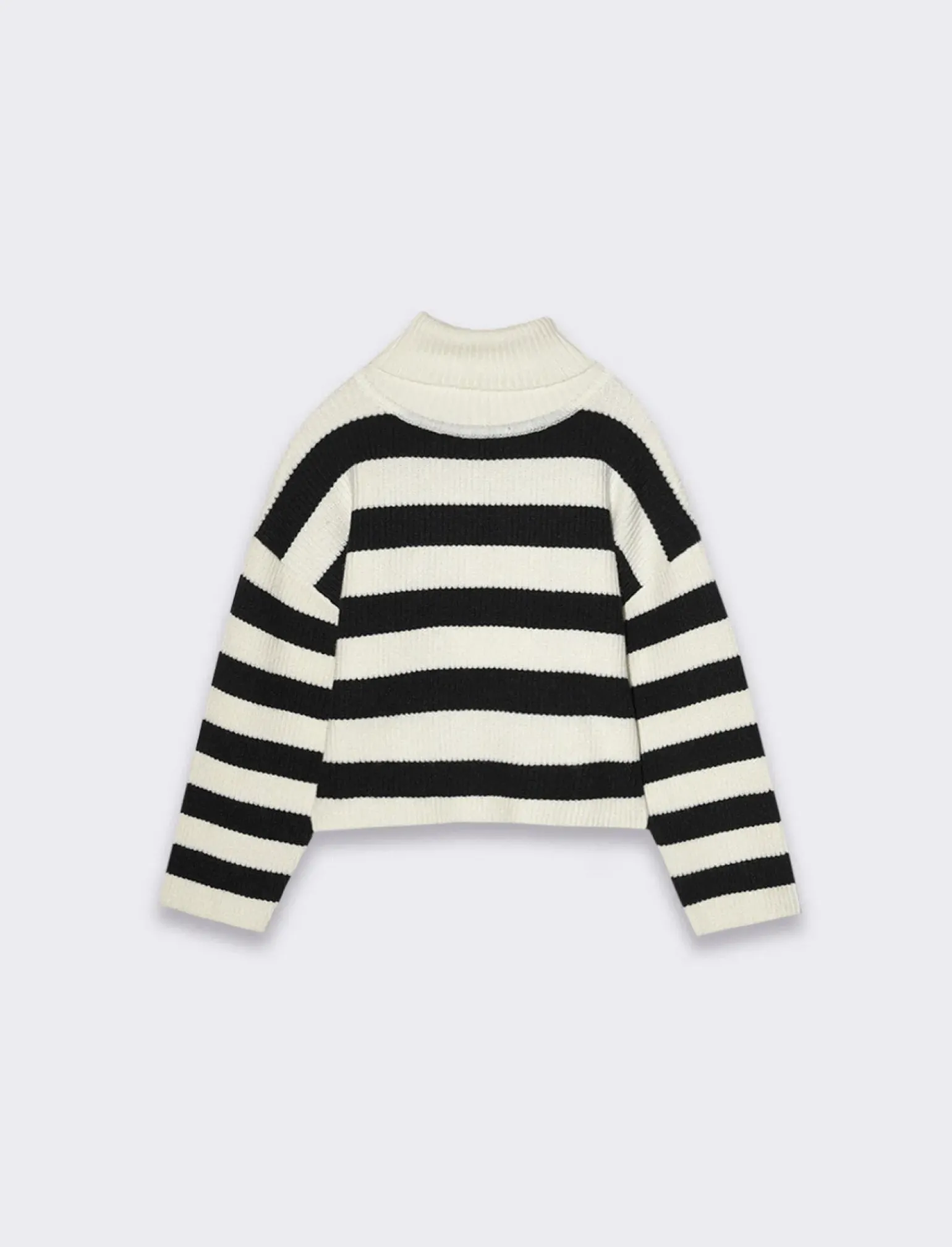 Maglione caldo da bambina a collo alto in viscosa rigato. Mano morbida. Il prodotto è di colore Righe