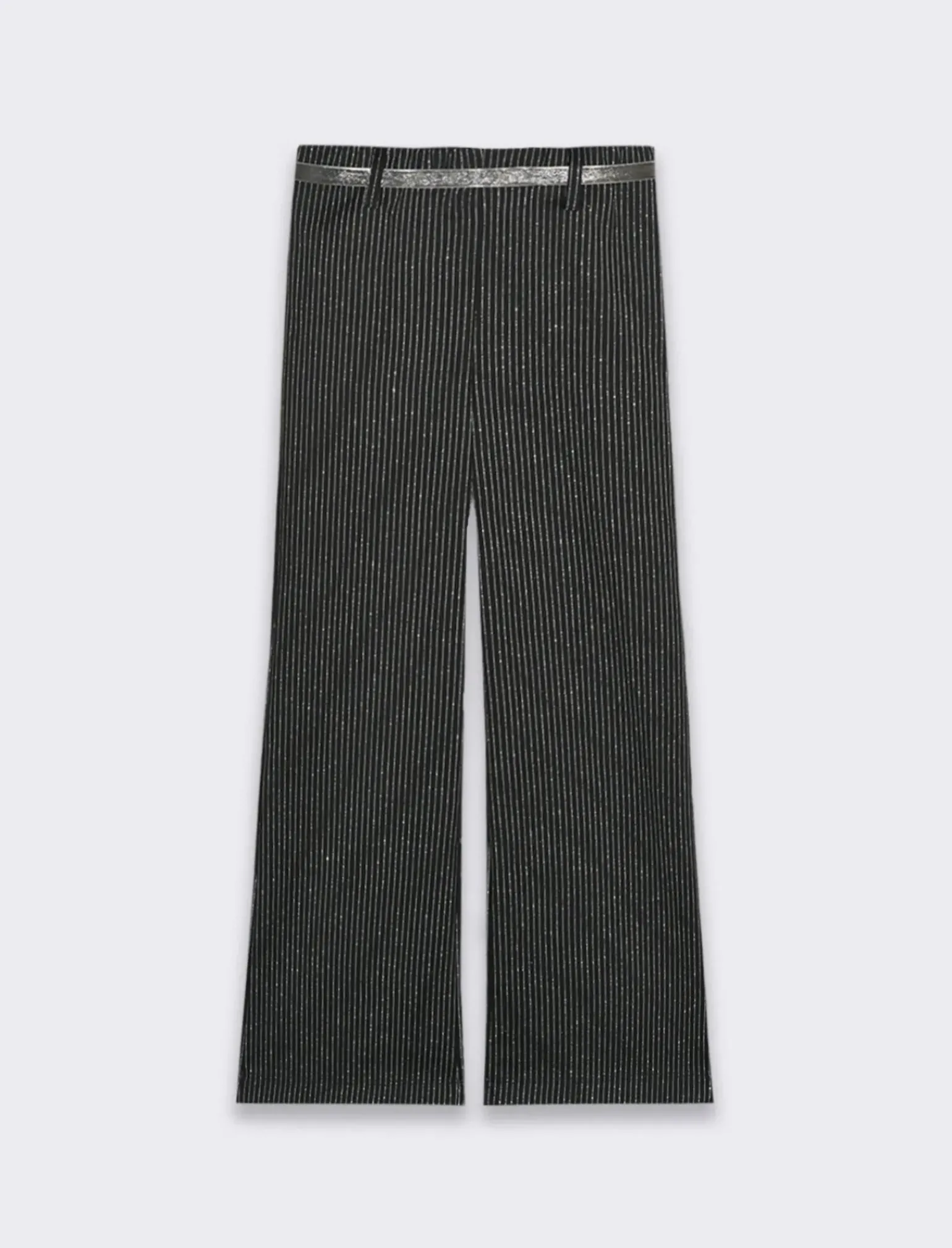 Pantaloni da bambina in tessuto elastico gessato, dalla vestibilità ampia con elastico in vita e cintura decorativa a fiocco. Il prodotto è di colore Nero