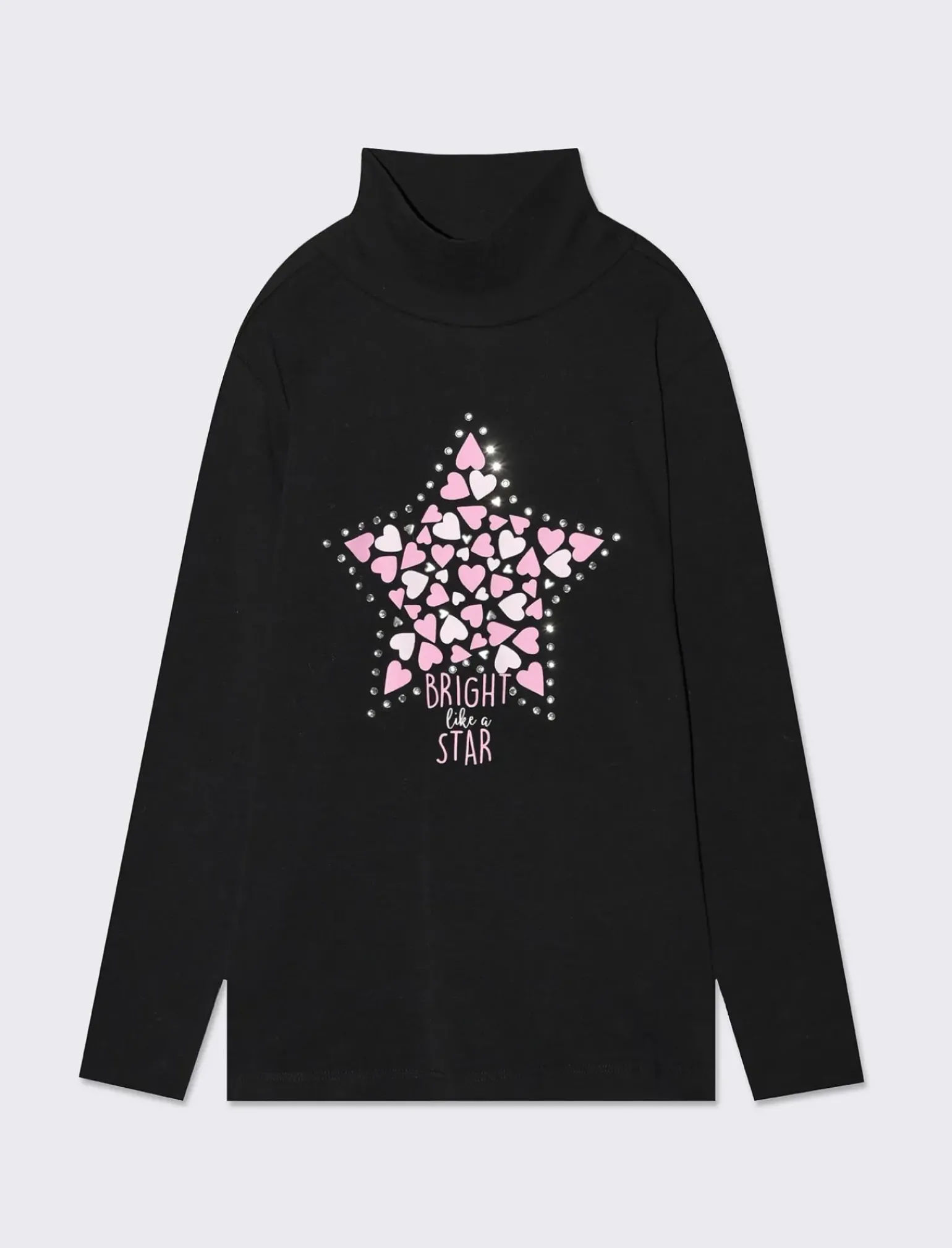Piazza Italia Bambina|T-Shirt E Top<Maglia a collo alto in cotone elasticizzato e stampe frontali con strass adesivi decorativi –
