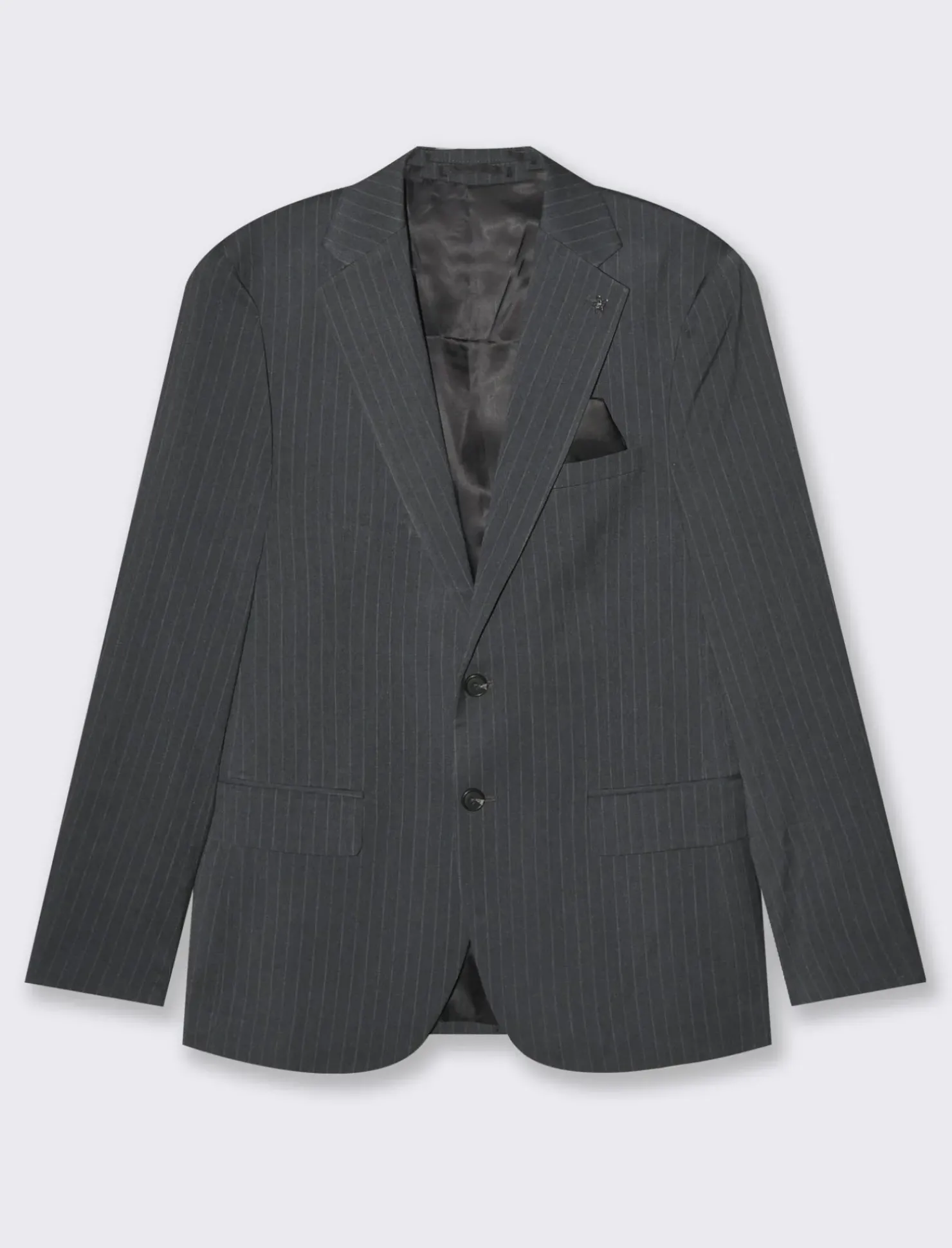 Blazer da completo dal taglio formale. Realizzato in tessuto fantasia gessata, presenta un elegante colletto a revers classici e maniche lunghe con dettaglio di bottoni sul polsino. La tasca a filetto completa di pochette sul petto conferisce un tocco di classe, mentre le tasche con patta aggiungono funzionalità al capo. Il prodotto è di colore Antracite melange
