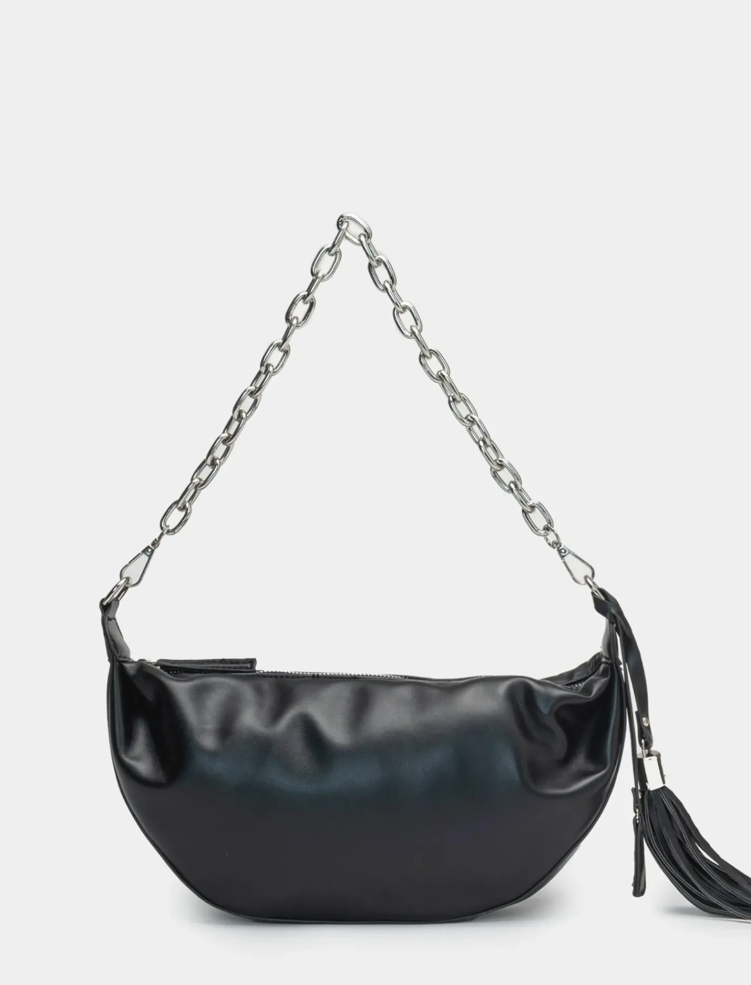 Borsa da donna modello mezzaluna con tracolla a catena, perfetta per completare il tuo outfit con stile. Le dimensioni di 34 cm x 18,5 cm x 5 cm la rendono pratica e capiente per portare con te tutti gli accessori di cui hai bisogno. Il prodotto è di colore Nero