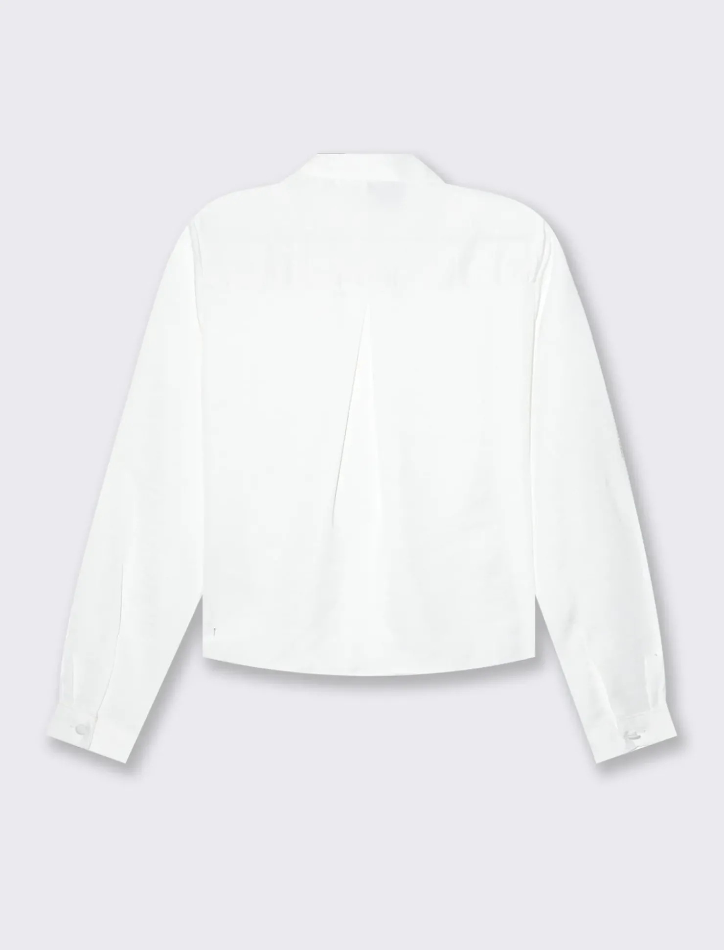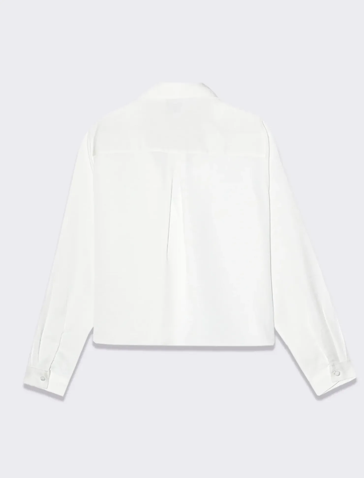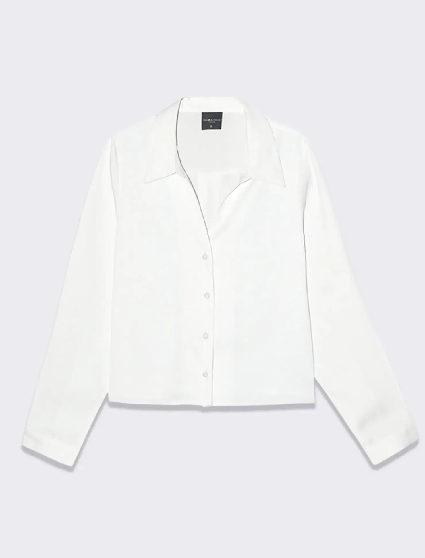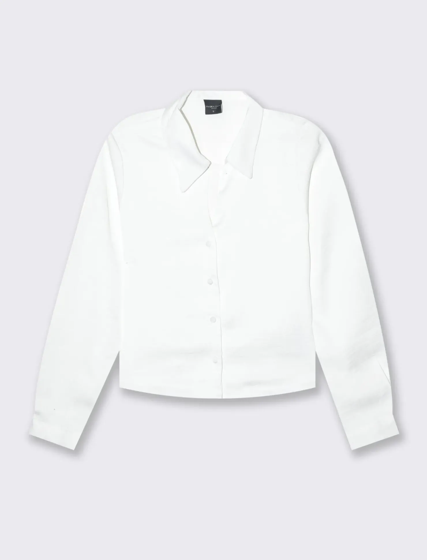 Camicia crop da donna con colletto e maniche lunghe, realizzata in satin. Il design presenta uno scollo a V e una vestibilità slim, arricchita da bottoni ricoperti dello stesso tessuto. Un capo elegante e versatile, perfetto per creare outfit raffinati e alla moda. Il prodotto è di colore Avorio