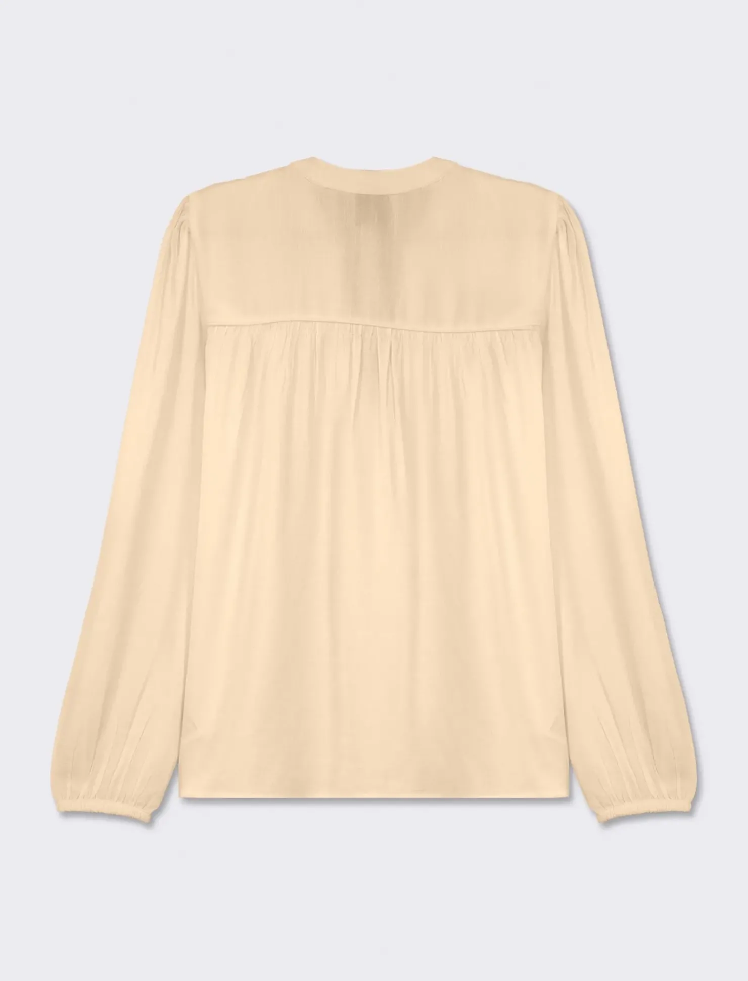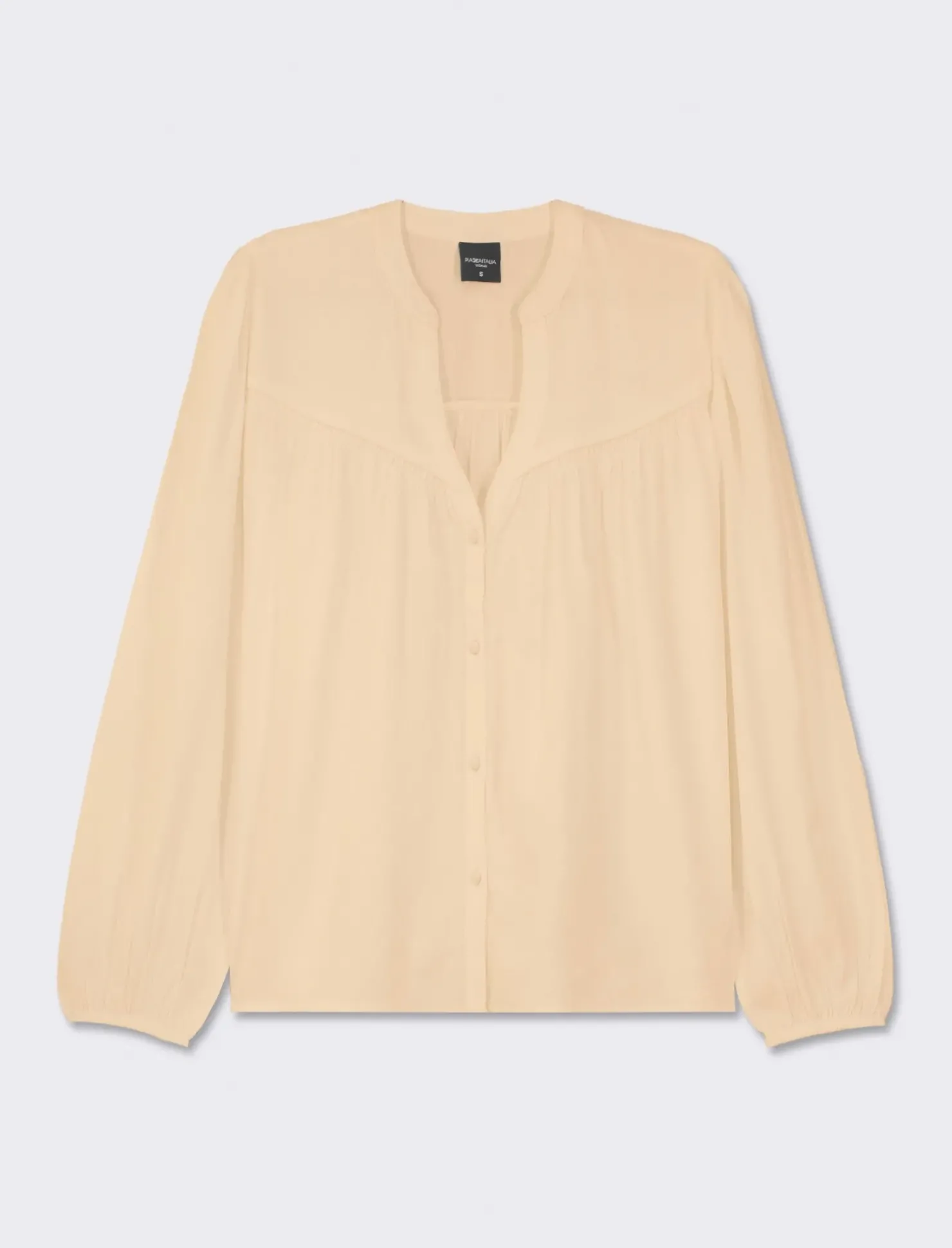 Camicia fluida da donna con collo alla coreana e maniche ampie con elastico. Realizzata con un’applicazione di nervature con arricciatura, questa camicia è perfetta per un look casual ma elegante. Ideale da abbinare a pantaloni o gonne per un outfit versatile e alla moda. Il prodotto è di colore Beige corda