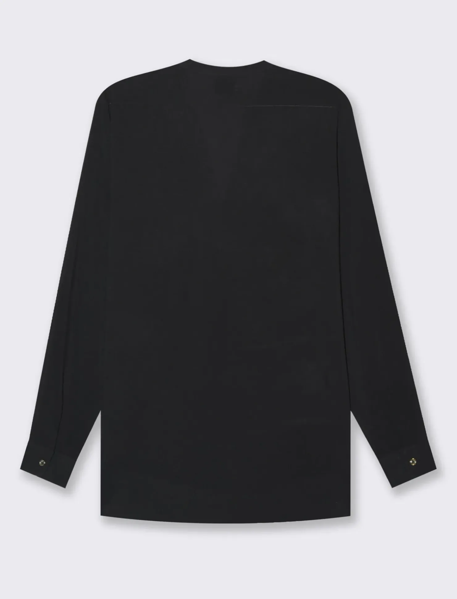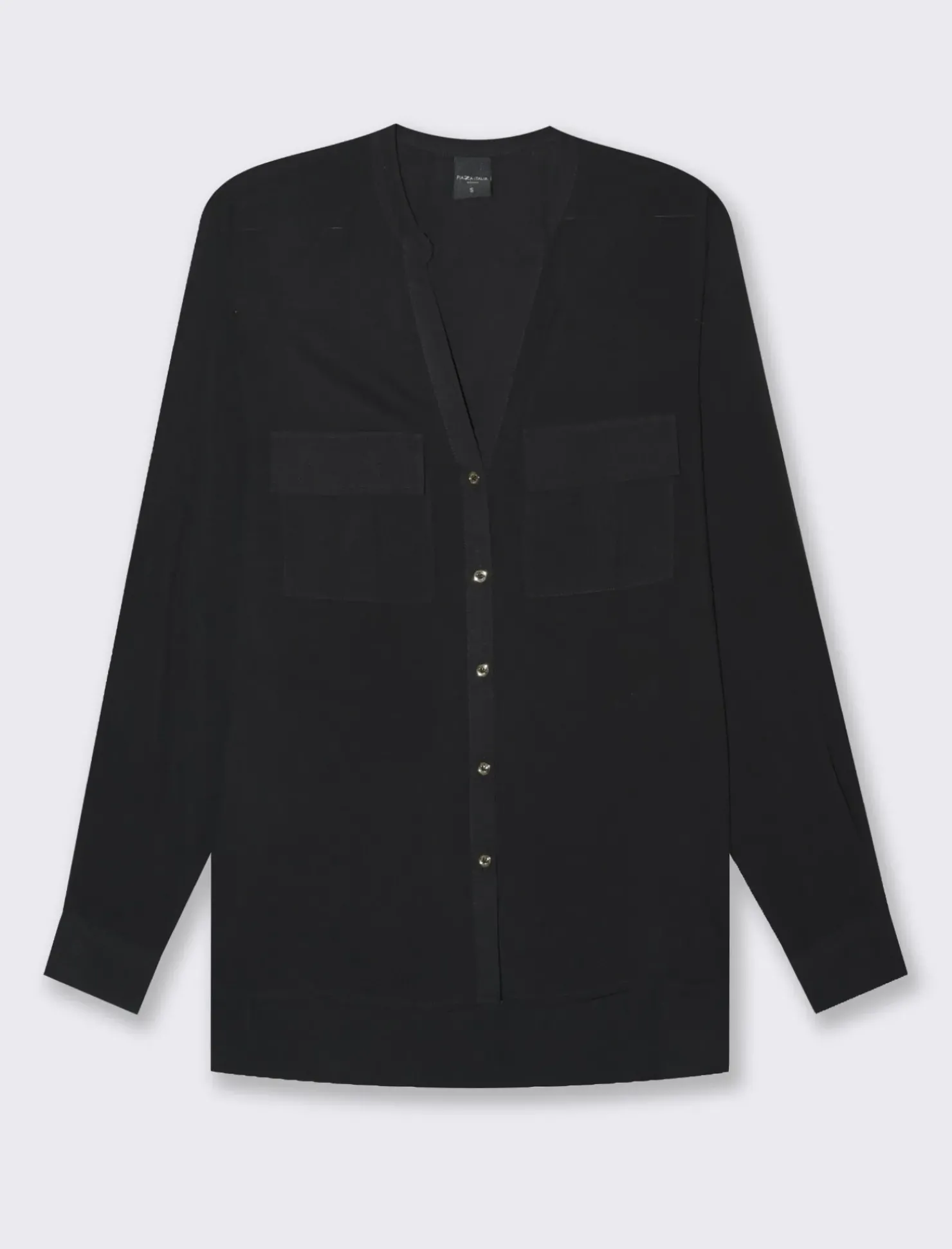 Camicia scollo a V per donna realizzata in morbida viscosa, con maniche lunghe che possono essere risvoltate grazie alle alette. Il particolare scollo a V è impreziosito da bottoni effetto metallo, mentre le tasche applicate aggiungono un tocco di praticità e stile. Il prodotto è di colore Nero