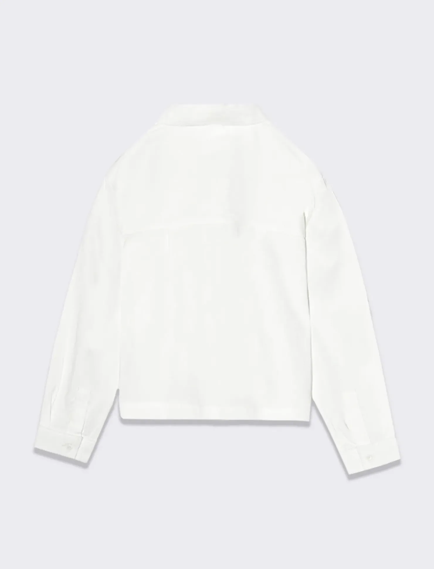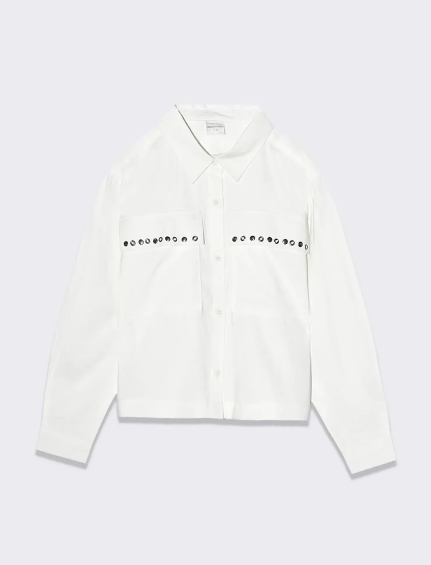 Camicia modello loose con tasconi per bambina: realizzata in tessuto morbido e cascante, questa camicia è perfetta per un look glamour e alla moda. I tasconi e i dettagli con borchie la rendono un capo trendy e comodo, ideale per le piccole fashioniste di oggi. Il prodotto è di colore Bianco sporco