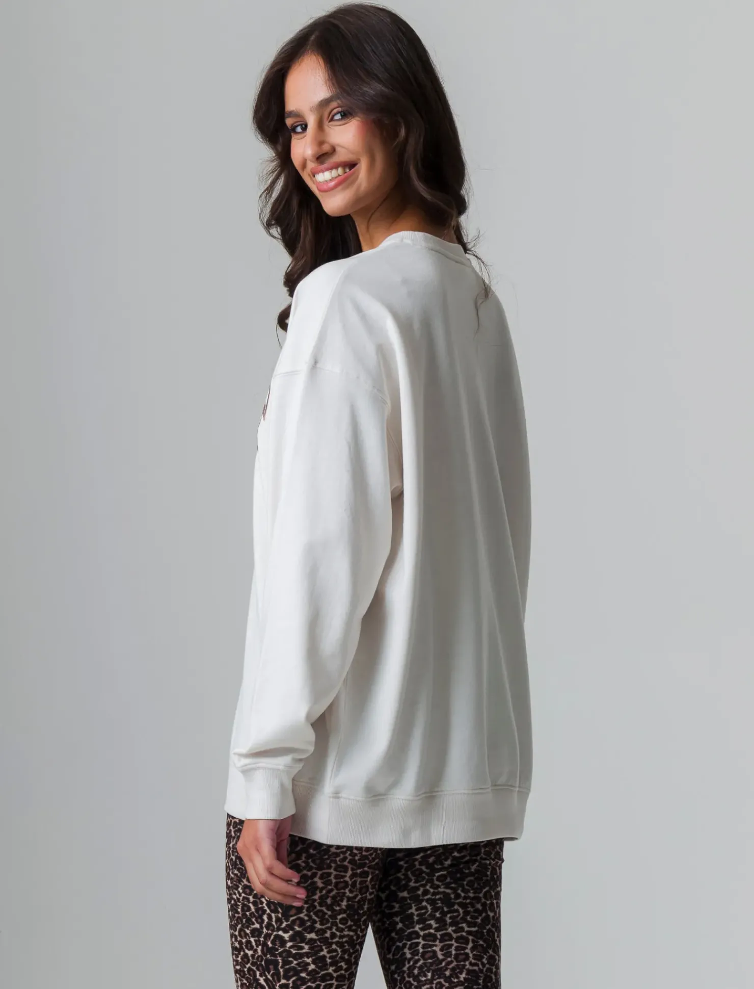 Felpa giro collo con patch ricamato, perfetta per la donna moderna che ama uno stile casual ma ricercato. La spalla scesa e la manica ampia conferiscono un tocco di originalità, mentre il patch applicato e ricamato aggiunge un tocco di personalità. L’interno garzato assicura comfort e calore, mentre le maniche e il fondo a costina elastica garantiscono una vestibilità perfetta. Il prodotto è di colore Avorio