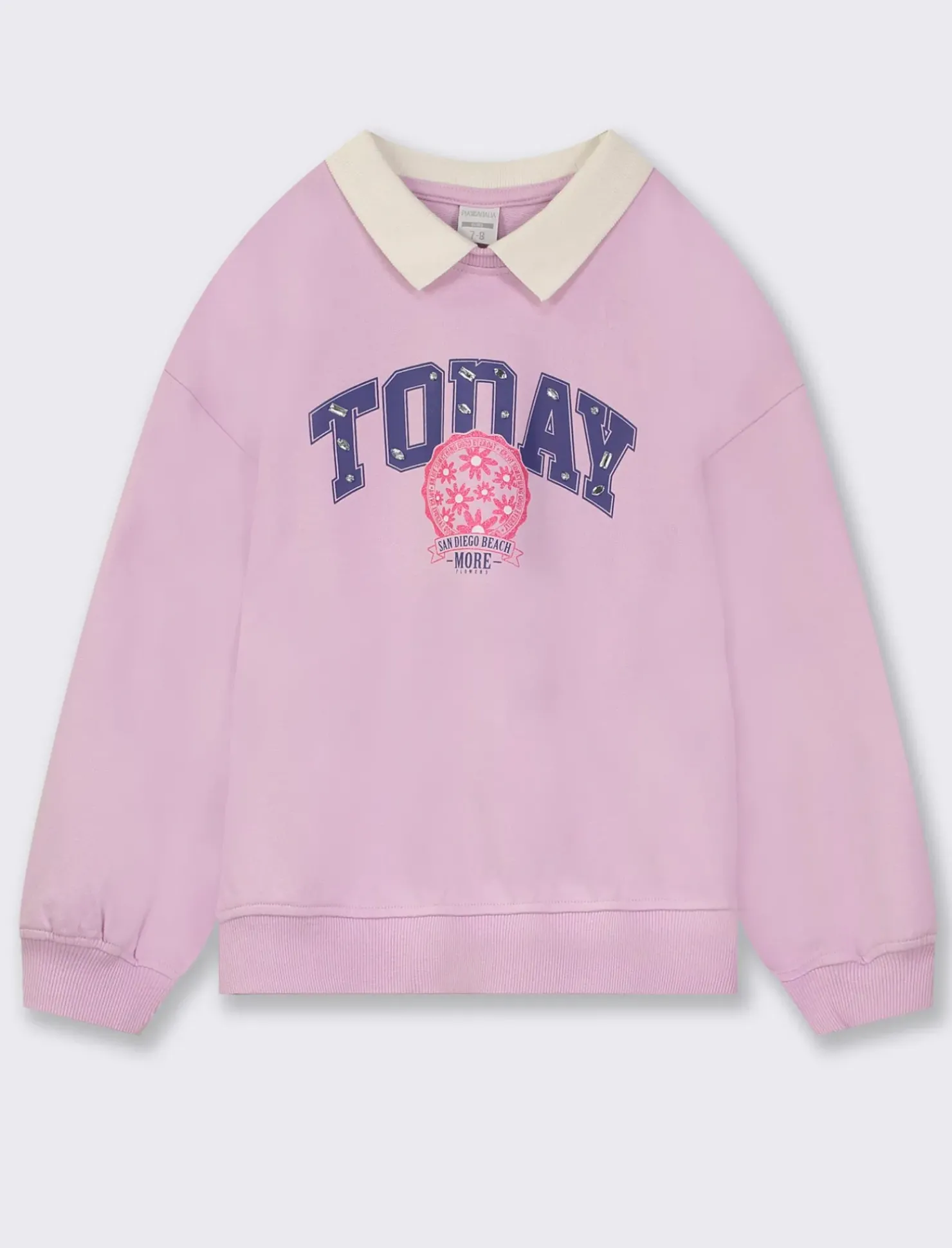 La felpa in cotone stile college per bambina è ideale per un look casual e comodo. Realizzata con colletto in costina e vestibilità ampia, presenta una stampa glitter e strass cuciti sul davanti per un tocco glamour. La lunghezza al bacino conferisce un’ottima vestibilità. Disponibile nella variante colore lilla, è un capo unico e alla moda per le più piccole. Il prodotto è di colore Lilla