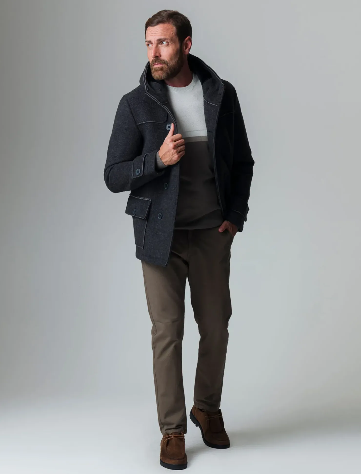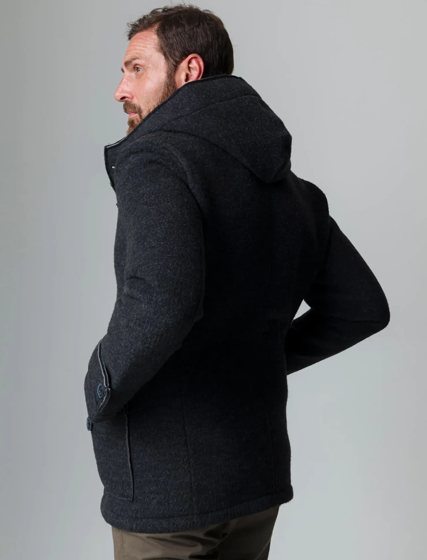 Giaccone doppiopetto pensato per l’uomo moderno, realizzato in un pregiato tessuto doppiato che garantisce calore e comfort. Il collo alto, abbinato a un cappuccio pratico, offre una protezione extra contro le intemperie. Le maniche lunghe assicurano una vestibilità perfetta, mentre le tasche a toppa con patta offrono spazio per gli oggetti essenziali. La chiusura frontale con abbottonatura a vista conferisce un tocco di eleganza, rendendolo ideale per ogni occasione. Il prodotto è di colore Grigio antracite