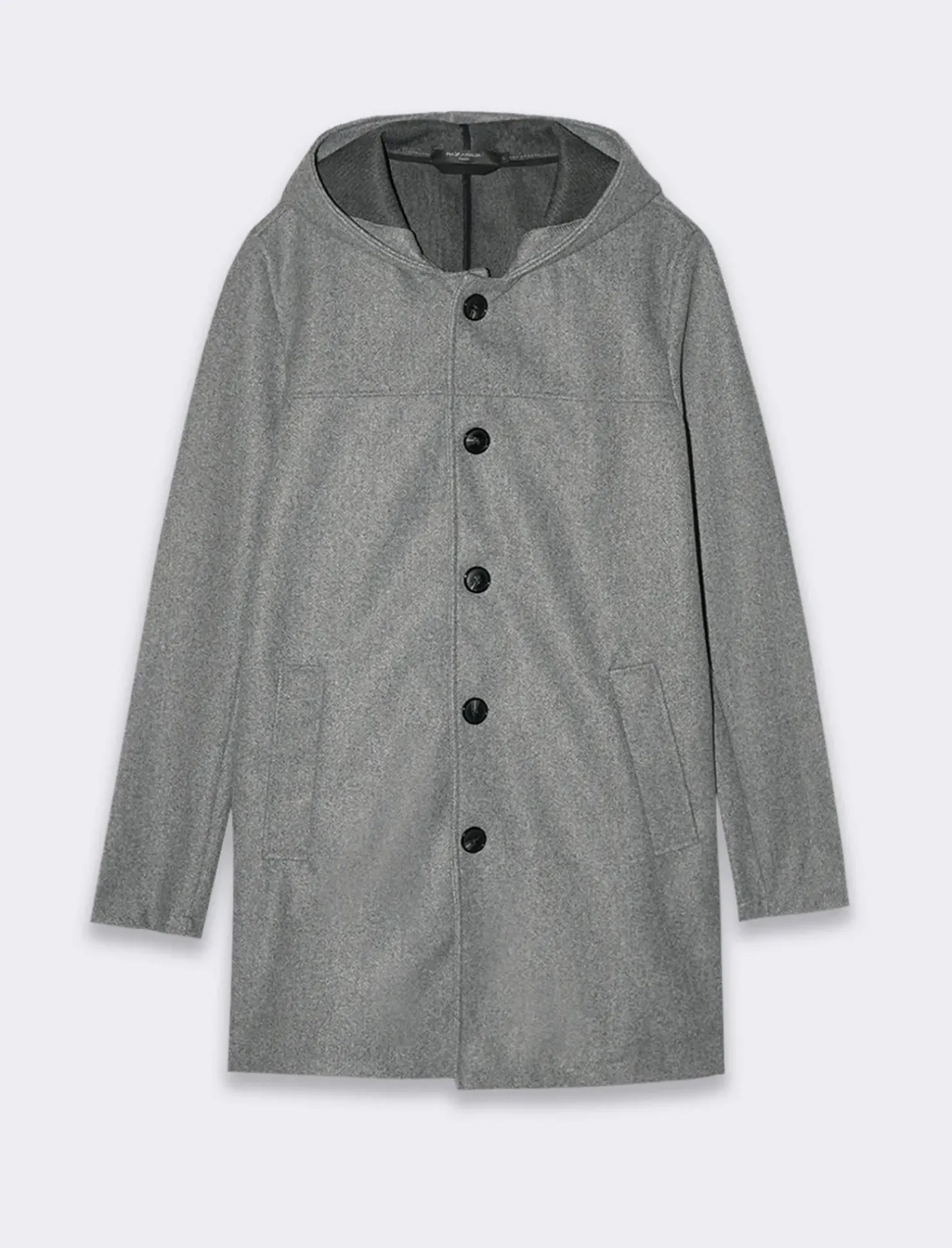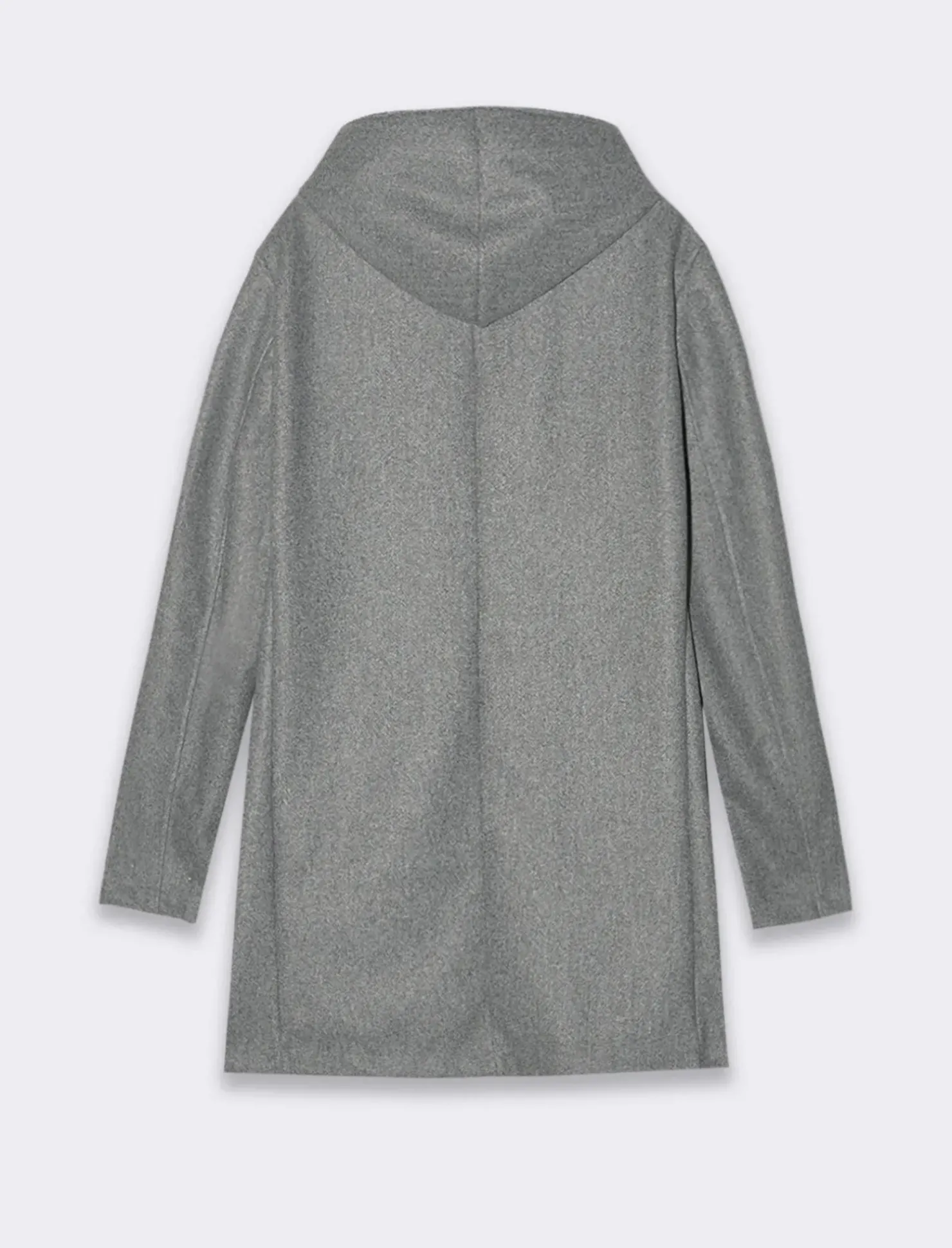 Giaccone realizzato in tessuto effetto lana. Collo con cappuccio integrato. Maniche lunghe. Tasche a filetto largo sul davanti. Chiusura frontale con abbottonatura a vista. Il prodotto è di colore Grigio mel.