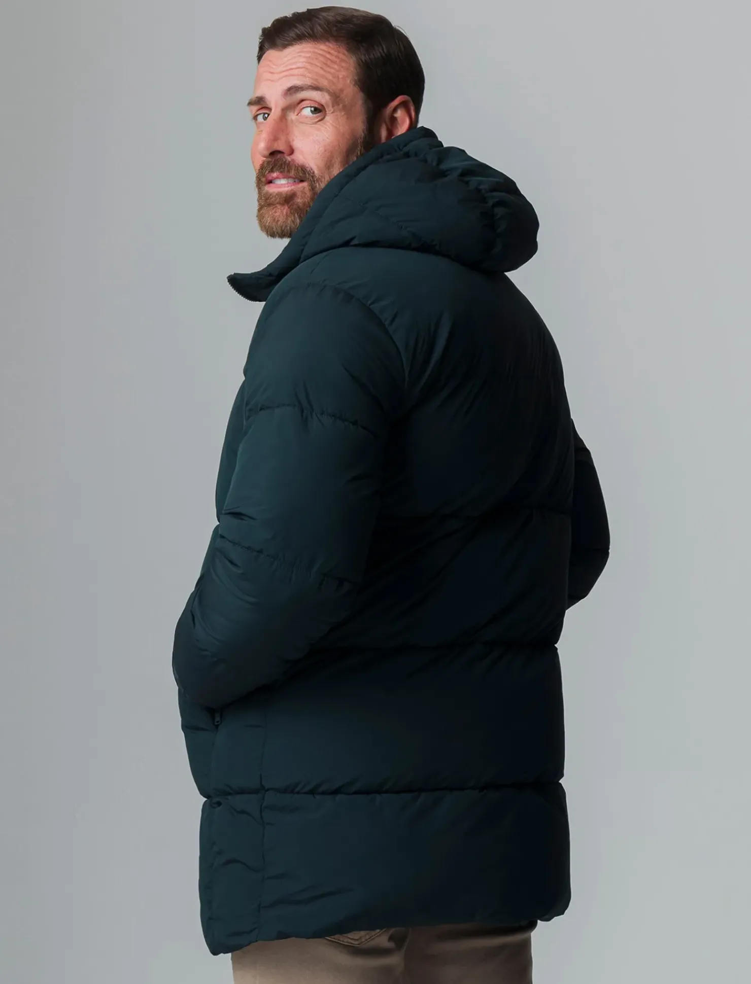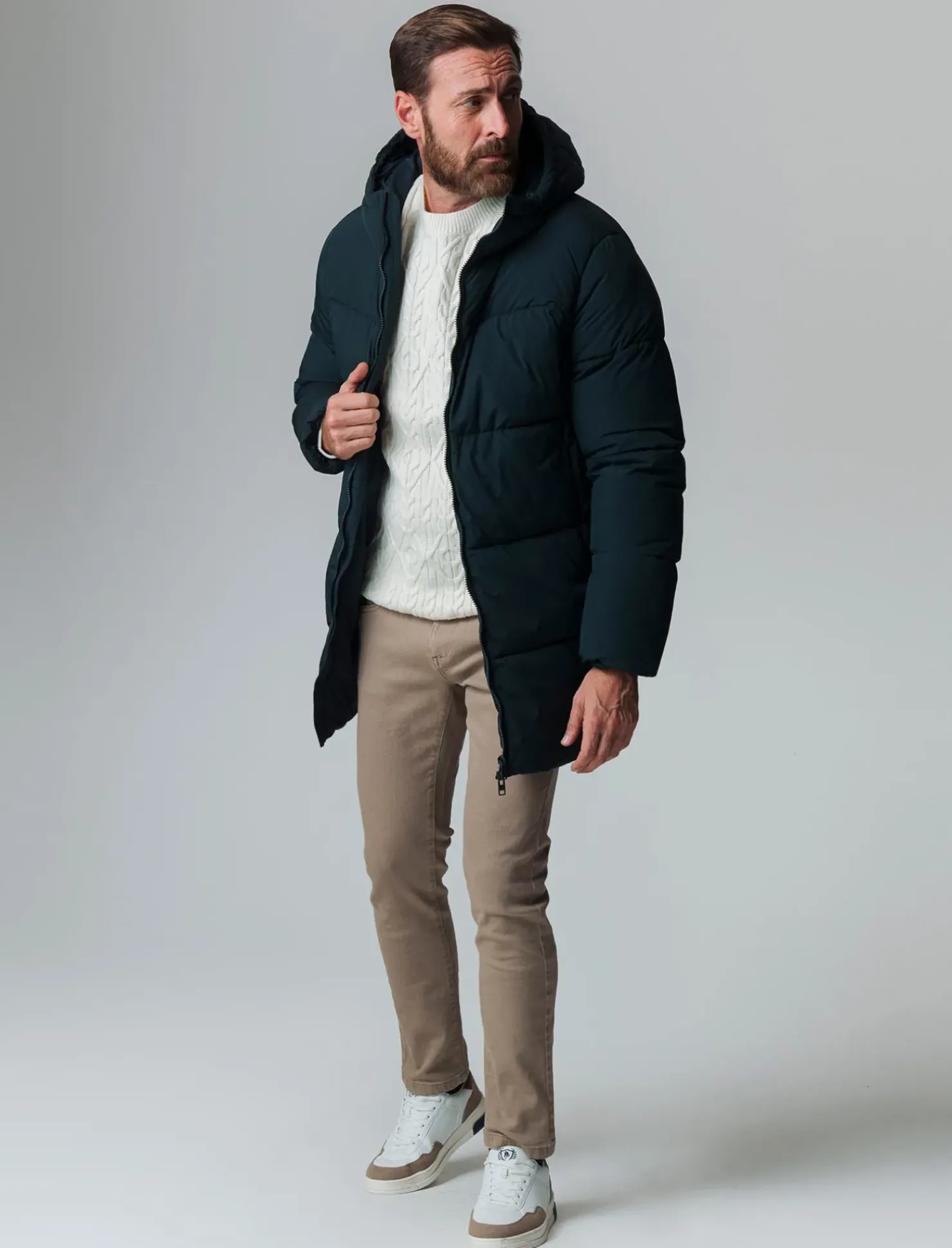 Giaccone lungo imbottito con cappuccio, ideale per affrontare le giornate più fredde. Realizzato in tessuto tecnico, offre una protezione ottimale dal freddo e dal vento. Il collo alto e il cappuccio regolabile garantiscono comfort e calore, mentre le maniche lunghe assicurano una vestibilità perfetta. Le tasche con cerniera invisibile sul davanti offrono praticità senza compromettere lo stile. La chiusura frontale con cerniera aggiunge un tocco moderno e funzionale. Un capo versatile per l’uomo contemporaneo. Il prodotto è di colore Verde