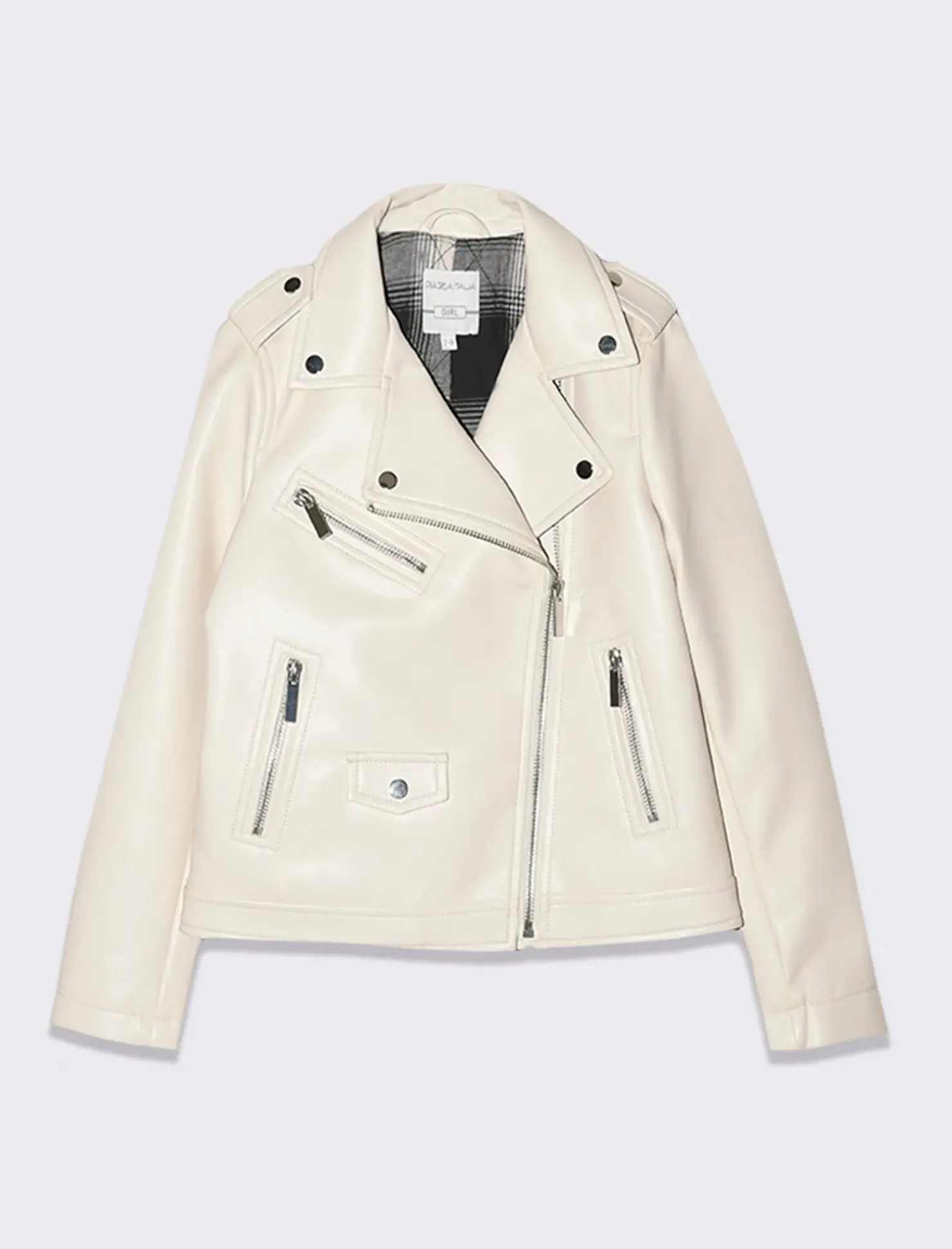 Giubbino modello chiodo in finta pelle per bambina, perfetto per un look rock e trendy. Con fodera stampa plaid, bottoni in metallo e passanti alle spalle per un tocco di stile in più. Il prodotto è di colore Beige