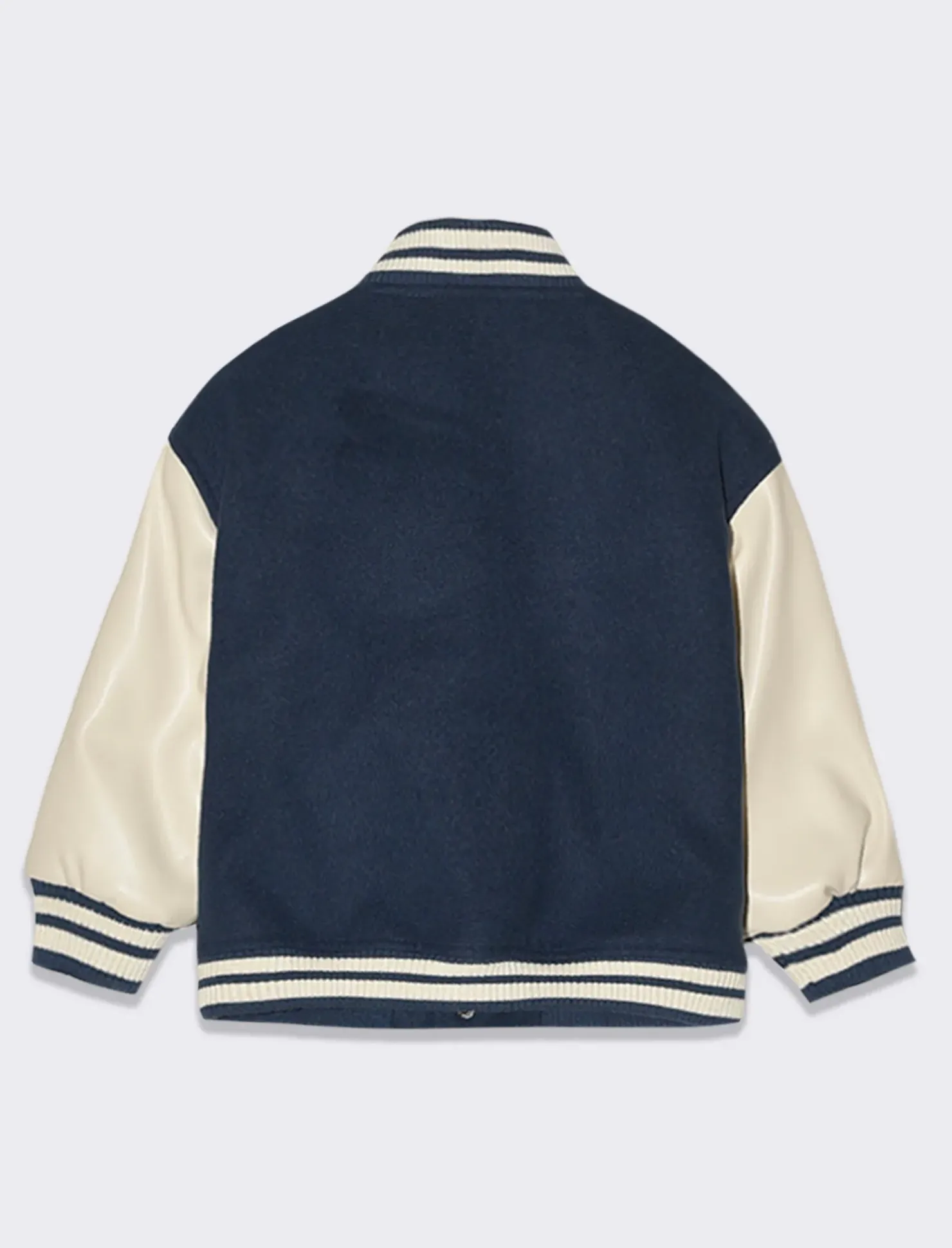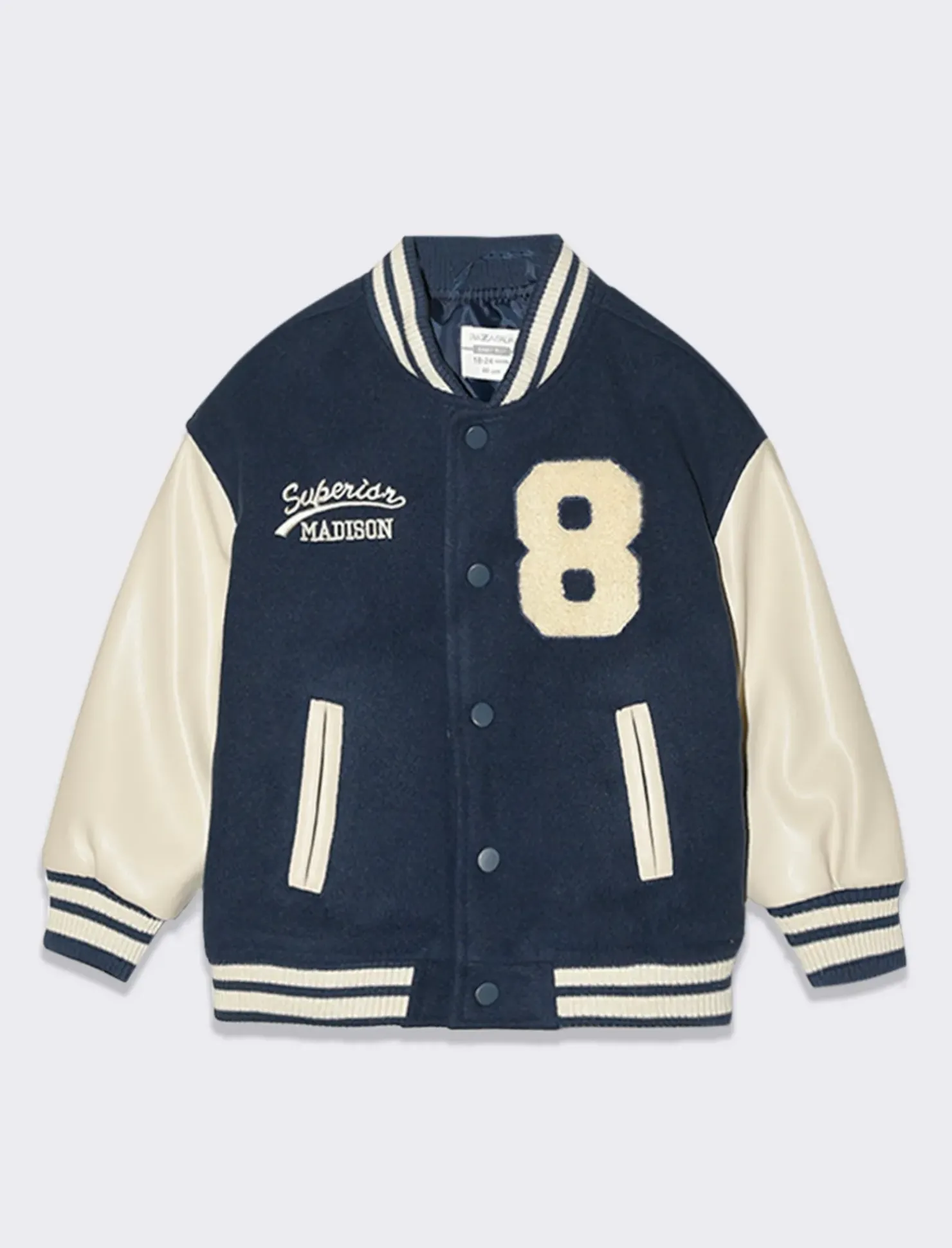 Giubbotto stile college per neonati, realizzato in morbido panno con maniche in similpelle. Ideale per completare outfit sportivi, presenta un’apertura con bottoni a pressione e costine sul fondo manica e al collo. Con ricami frontali che lo rendono ancora più irresistibile per i più piccoli fashionisti in erba. Il prodotto è di colore Blu