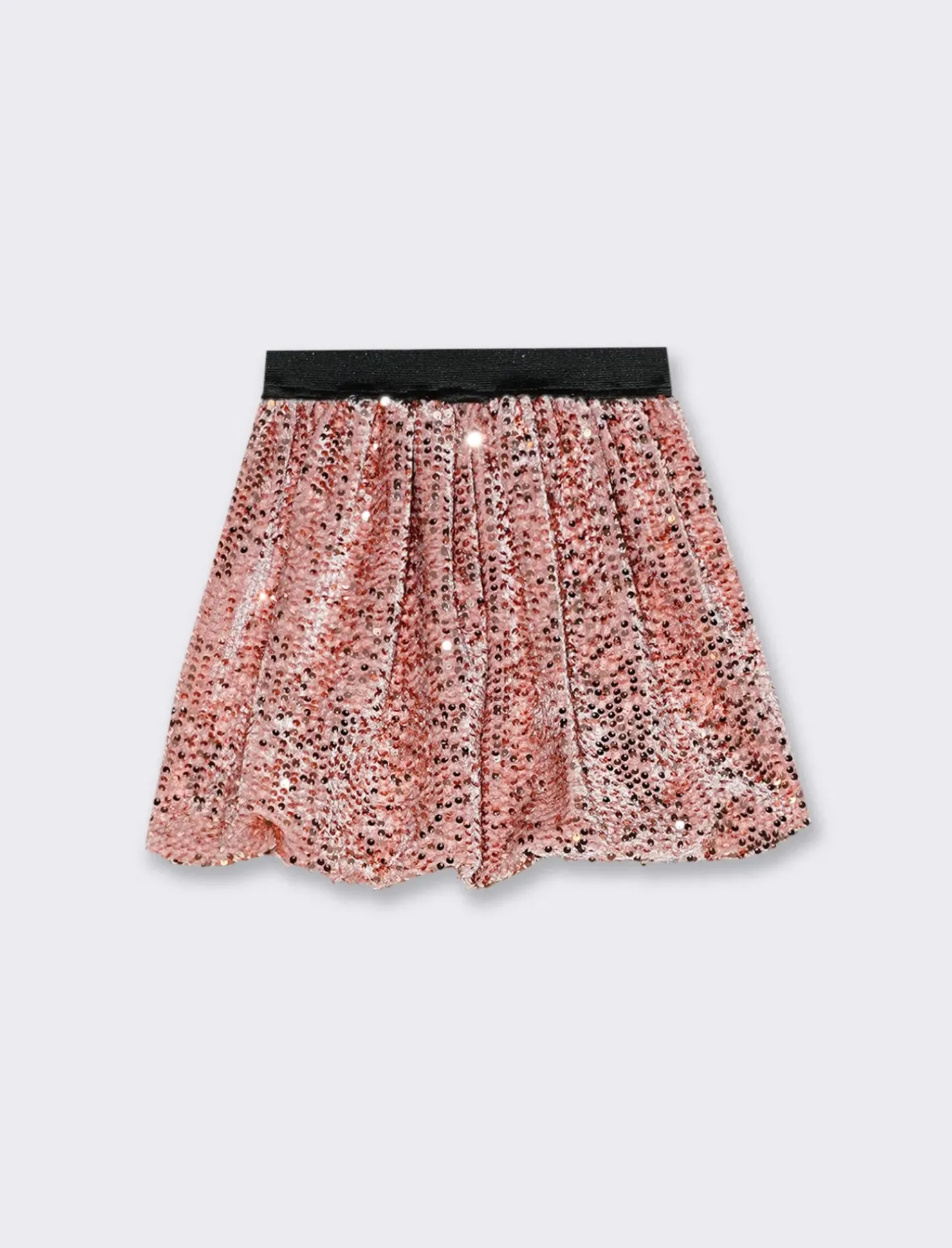 Gonna a palloncino in tessuto velour arricchito da paillettes reversibili; interno foderato e vita con elastico a contrasto. Il prodotto è di colore Rosa