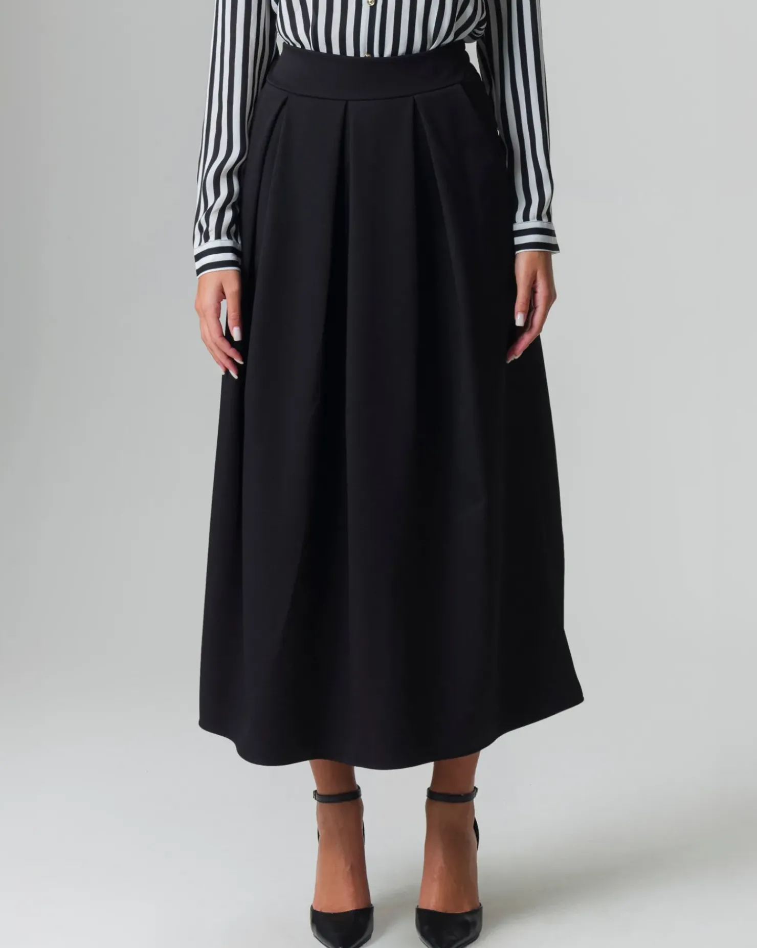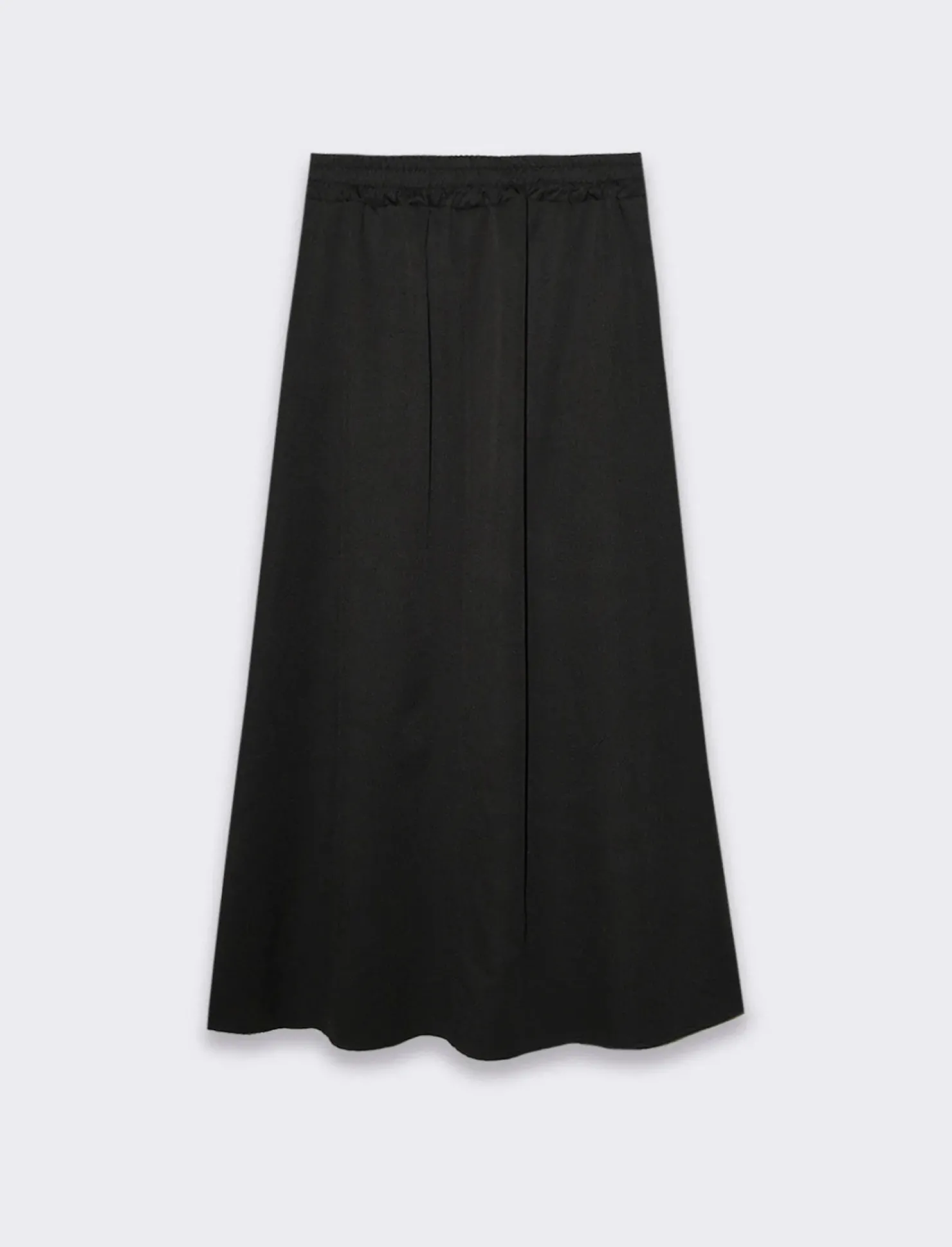 Questa gonna ha un elastico sul retro, che garantisce una vestibilità comoda e adattabile, permettendo di indossarla facilmente e di muoversi con libertà. Le tasche a taglio sui fianchi sono discrete e funzionali. La lunghezza della gonna aggiunge un tocco di raffinatezza, rendendola adatta sia per occasioni casual che per eventi più formali. Questa gonna è ideale per essere abbinata a bluse, maglioni o top eleganti, offrendo molteplici opzioni di stile. Il prodotto è di colore Nero
