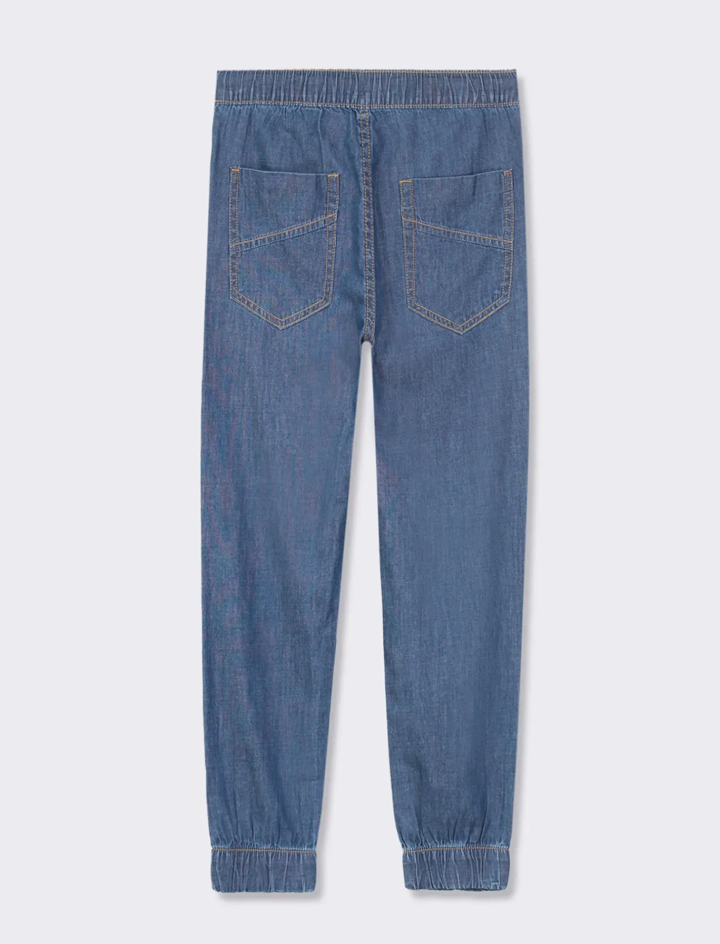 Il pantalone modello jogger in denim per bambini è perfetto per un look comodo e alla moda. Realizzato in morbido denim, con elastico sia in fondo alla gamba che in vita, assicura una vestibilità comoda e adatta a ogni movimento. I dettagli sartoriali lo rendono un capo versatile e di tendenza, perfetto per ogni occasione. Gli elastici consentono di regolare la vestibilità, assicurando il massimo comfort. Combinatelo con una t-shirt stampata o una felpa per un look casual e alla moda. Il prodotto è di colore Denim