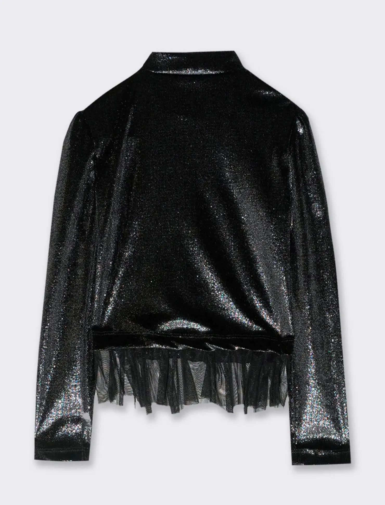Maglietta mezzo collo, in morbido tessuto lucido, con balza di tulle al fondo e fiocco applicato sul cuore. Perfetta da indossare per un evento mondano in cui si vuole catturare l’attenzione Il prodotto è di colore Nero