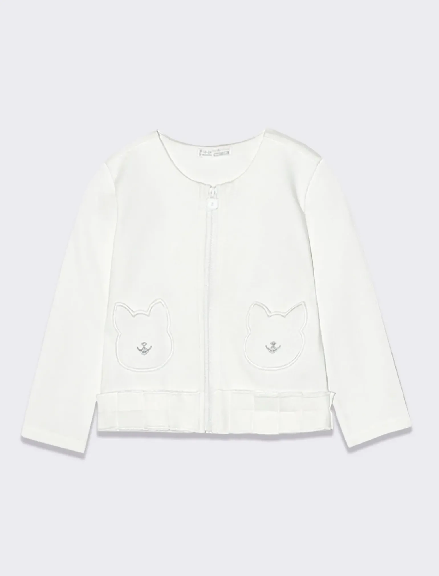 Felpa per neonata in punto milano con zip e taschine a forma di gatto con ricamo in lurex. Il design ricercato e le taschine divertenti la rendono perfetta per le piccole fashioniste in erba. Con rouche al fondo per un tocco di dolcezza in più. Il prodotto è di colore Bianco panna