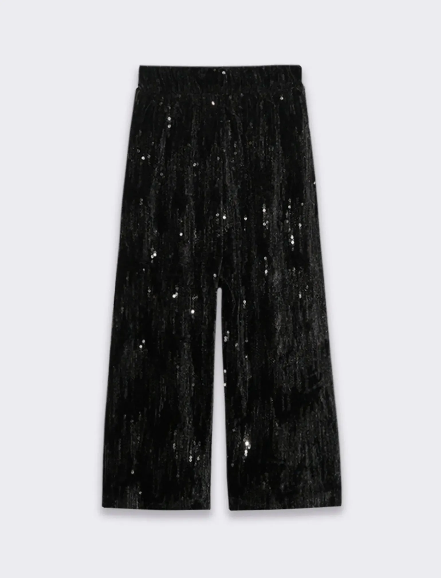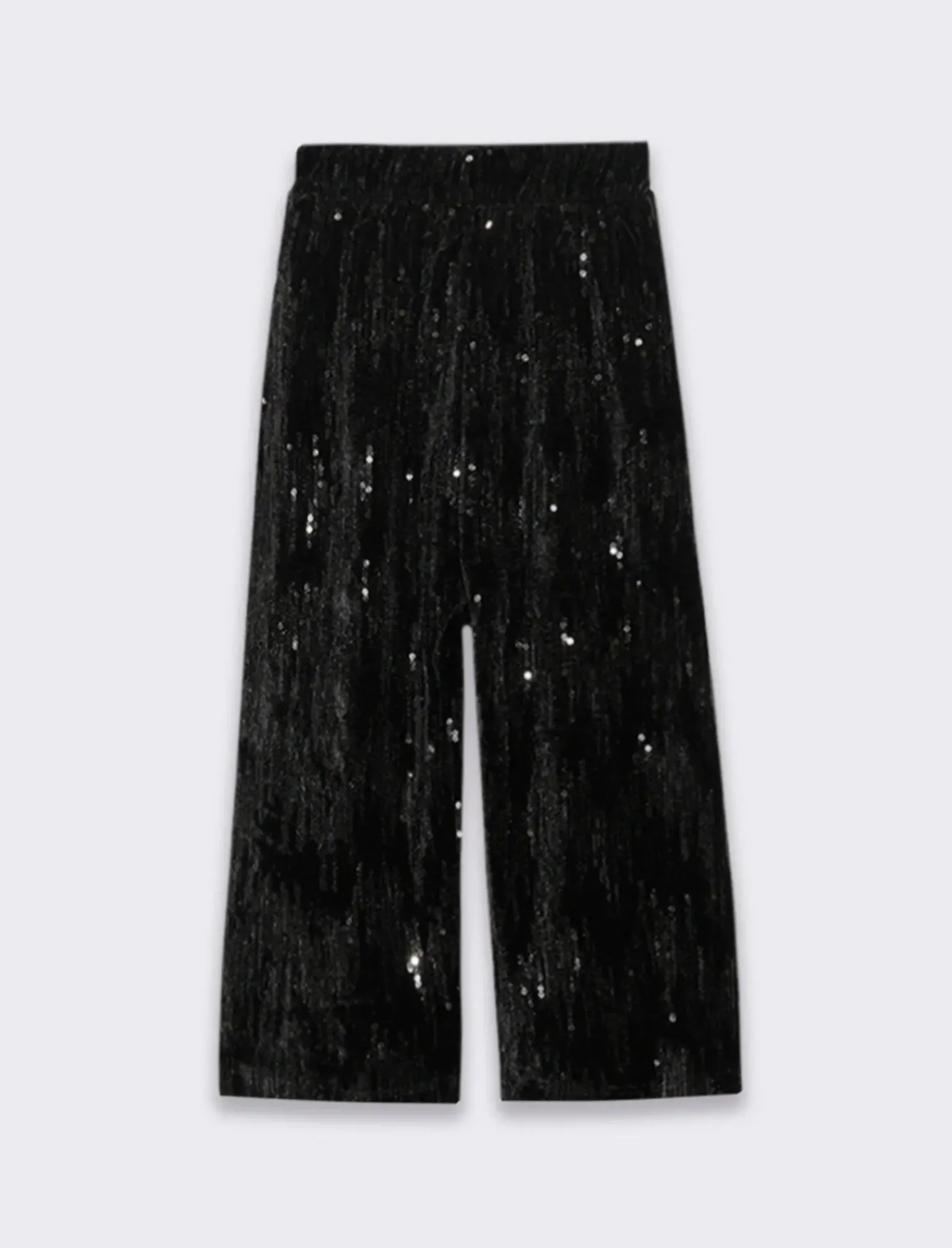 Pantaloni ampi realizzati in tessuto vellutino, che offrono una sensazione di lusso e morbidezza al tatto. Le paillettes applicate lungo la superficie aggiungono un tocco di brillantezza e glamour, rendendo questi pantaloni perfetti per feste e serate fuori. La vita elastica garantisce un comfort ottimale, permettendoti di muoverti liberamente e di sentirti a tuo agio per tutta la serata. Questi pantaloni combinano eleganza e praticità, creando un look sofisticato e scintillante che non passerà inosservato.Il presente prodotto è conforme al rischio generico di sicurezza di cui allart.5 del Regolamento Europeo 988/2023. Il prodotto è di colore Nero