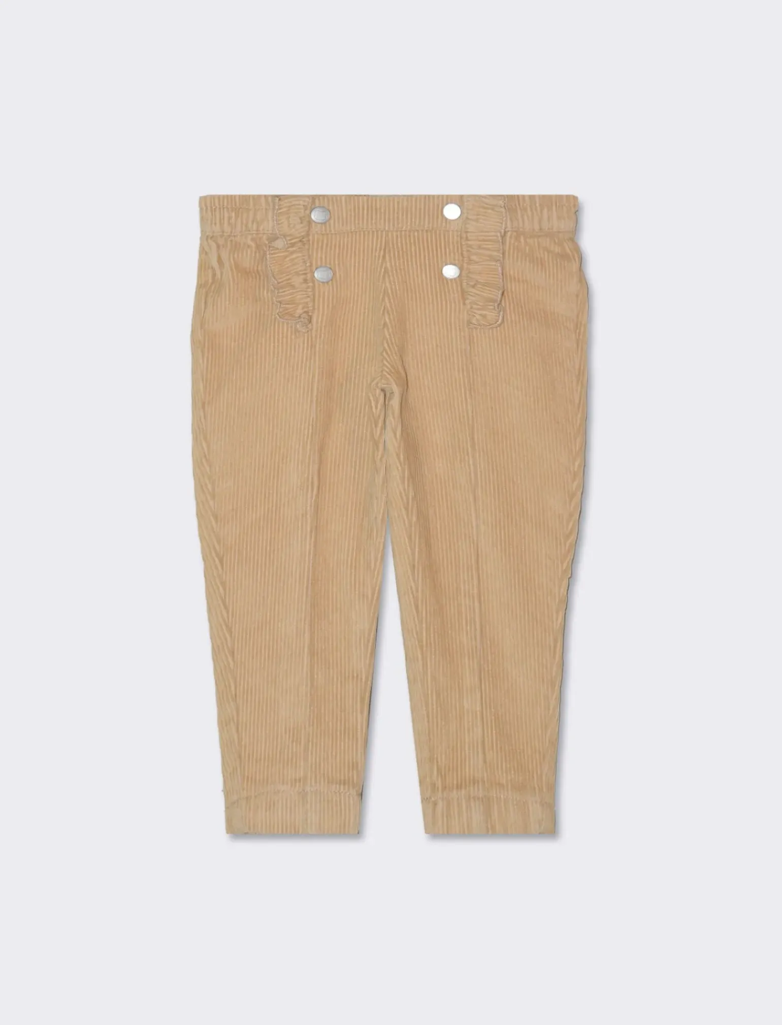 Pantaloni in velluto a coste per neonata, caratterizzati da rouches frontali e bottoni decorativi. Ideali per creare outfit romantici e raffinati per le piccole principesse. Realizzati con materiali di alta qualità, garantiscono comfort e stile per le giornate più speciali dei bambini. Il prodotto è di colore Beige