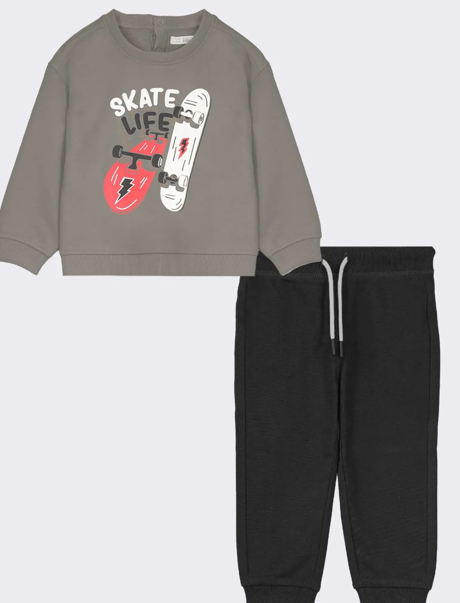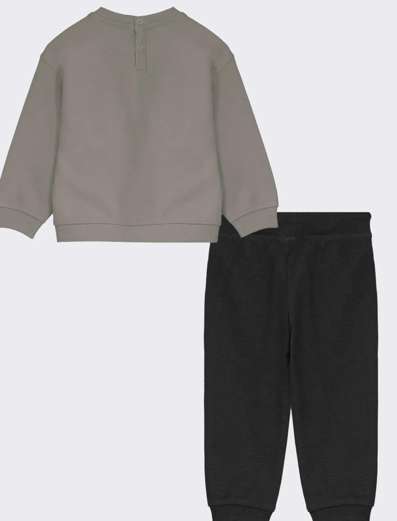 Tuta sportiva per bambini composta da felpa e pantaloni jogger. La felpa presenta una stampa frontale divertente, mentre i jogger sono in tinta unita. Disponibile in tre diverse varianti di colore, ideale per un look casual e comodo per i più piccoli. Il prodotto è di colore Grigio piombo
