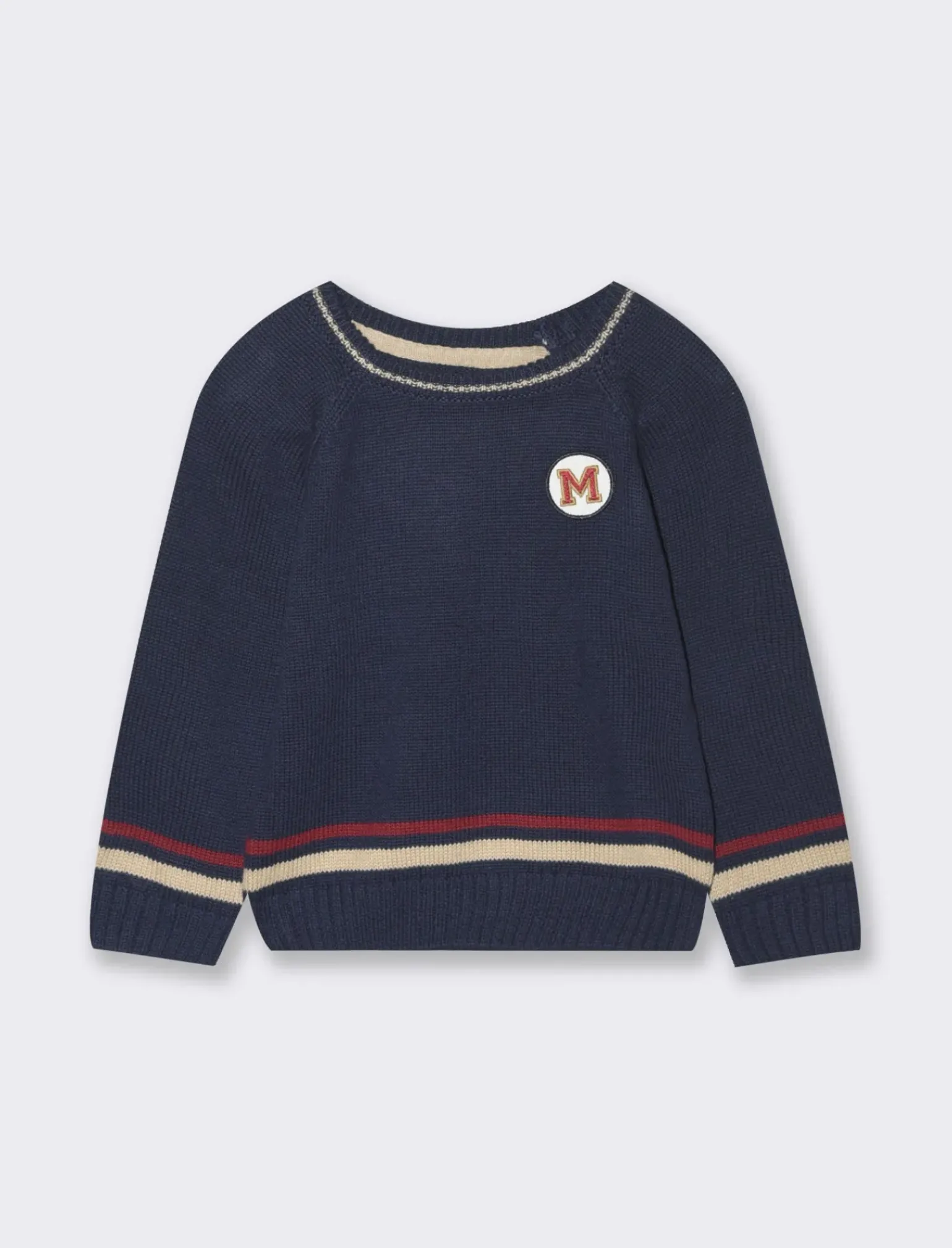Maglia girocollo per neonato realizzata in morbido cotone e acrilico, perfetta per tenere al caldo i più piccoli. Le righe jacquard in contrasto e il patch stile varsity la rendono un capo trendy e divertente, ideale per completare il guardaroba dei bambini con stile e comfort. Il prodotto è di colore Blu