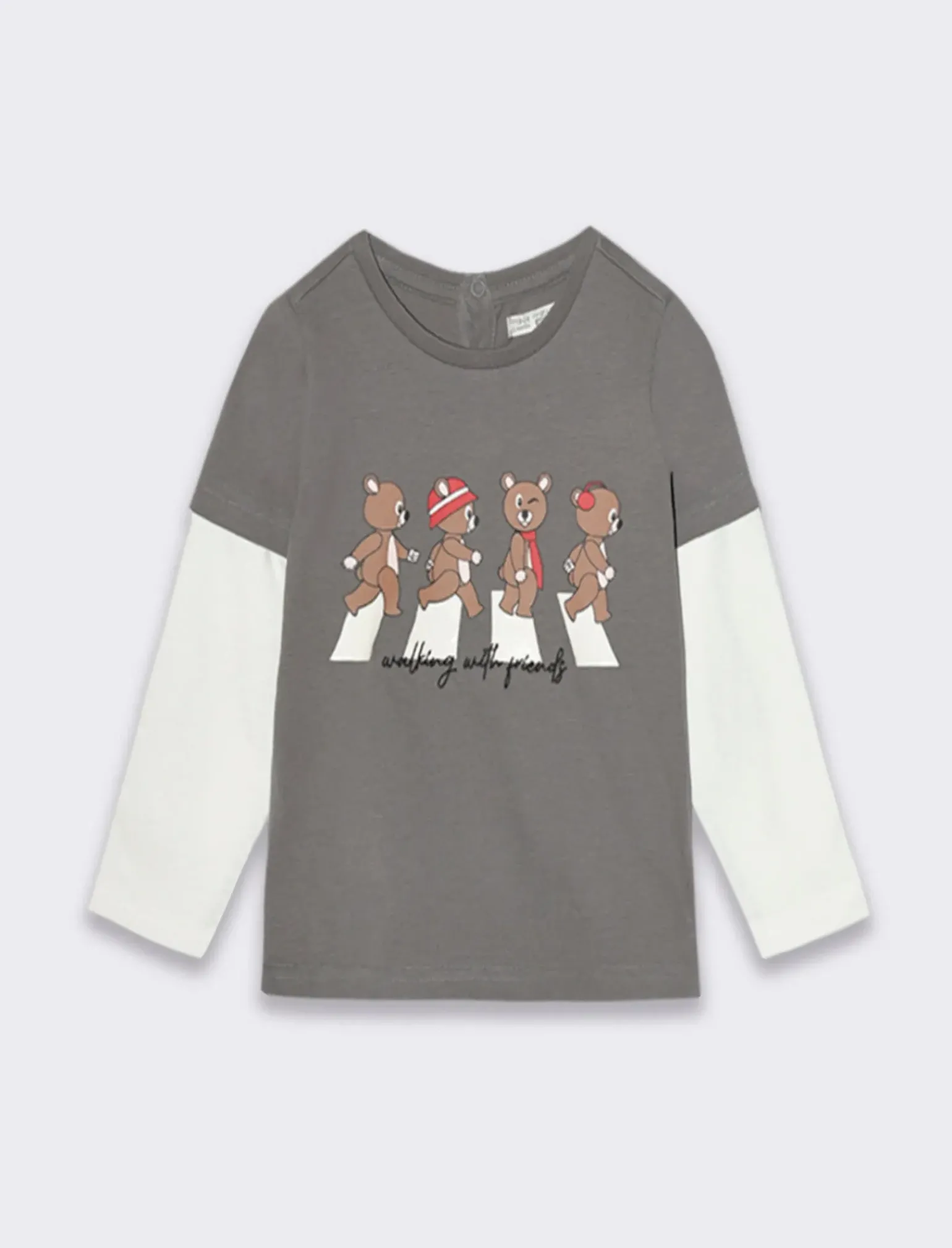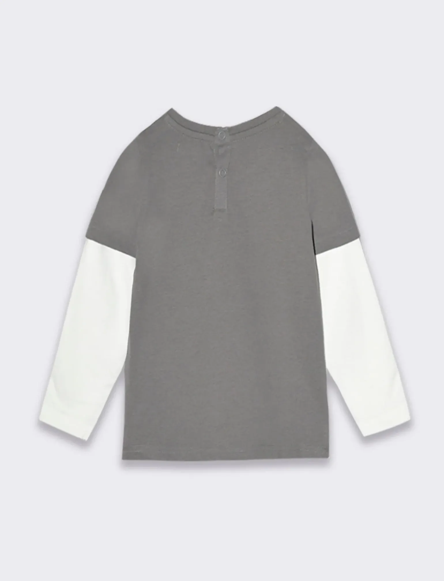 MAGLIETTA GIROCOLLO CON DOPPIA MANICA IN COLORI A CONTRASTO, PER OUTFITS DALLO STILE URBAN. STAMPA FRONTALE E CHIUSURA CON BOTTONCINI A PRESSIONE. Il prodotto è di colore Grigio piombo