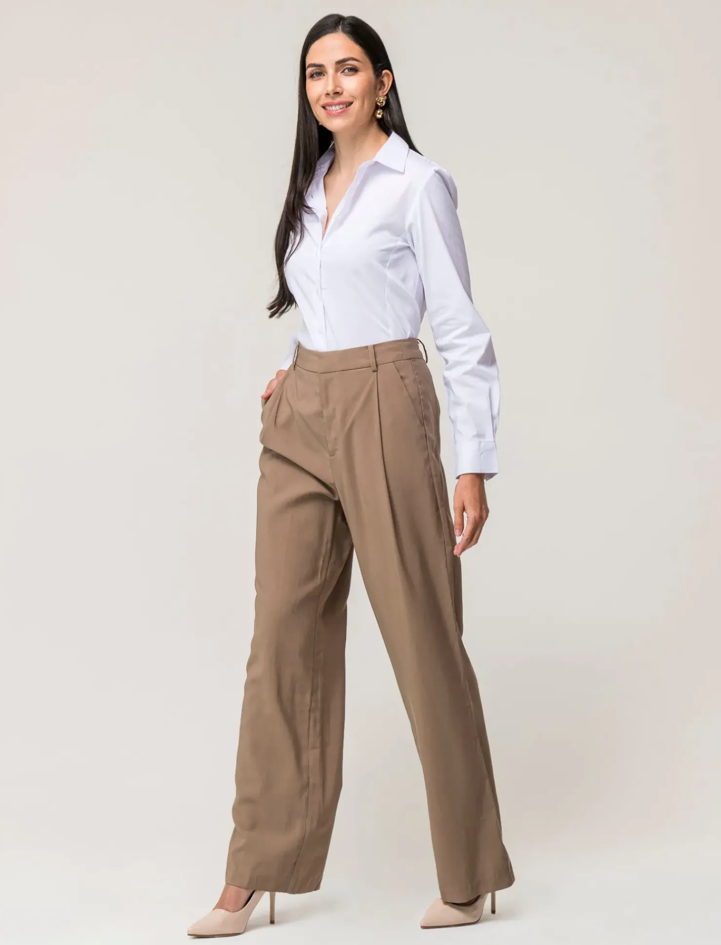 Pantalone formale da donna, modello palazzo in tessuto fluido. L’abbottunatura con gancio e bottone conferisce un tocco di eleganza e raffinatezza. Perfetto per un look sofisticato e chic, ideale per occasioni speciali o per un outfit da ufficio impeccabile. Un capo versatile e di classe, che non può mancare nel guardaroba di ogni donna moderna e alla moda. Il prodotto è di colore Grigio castoro